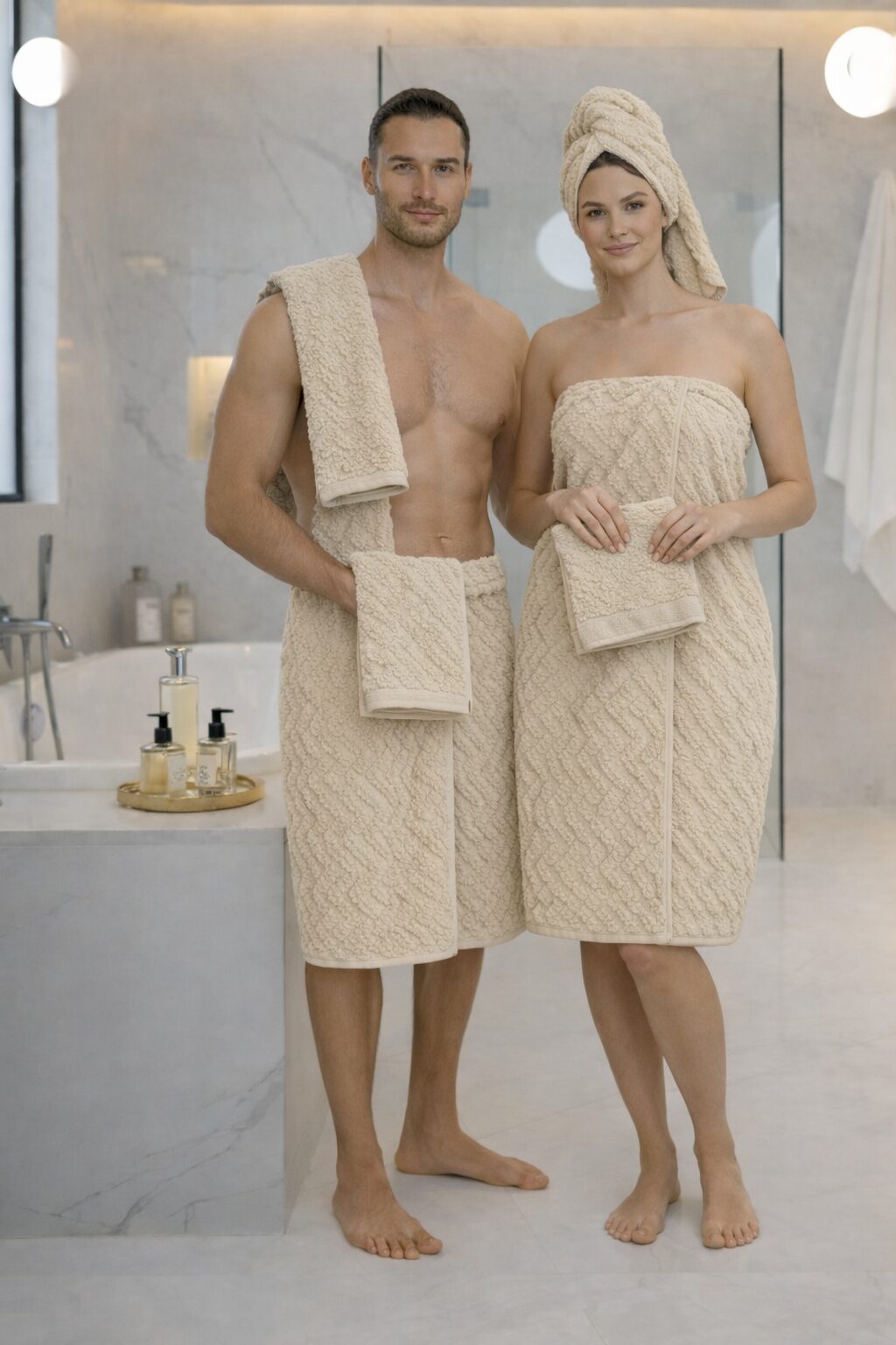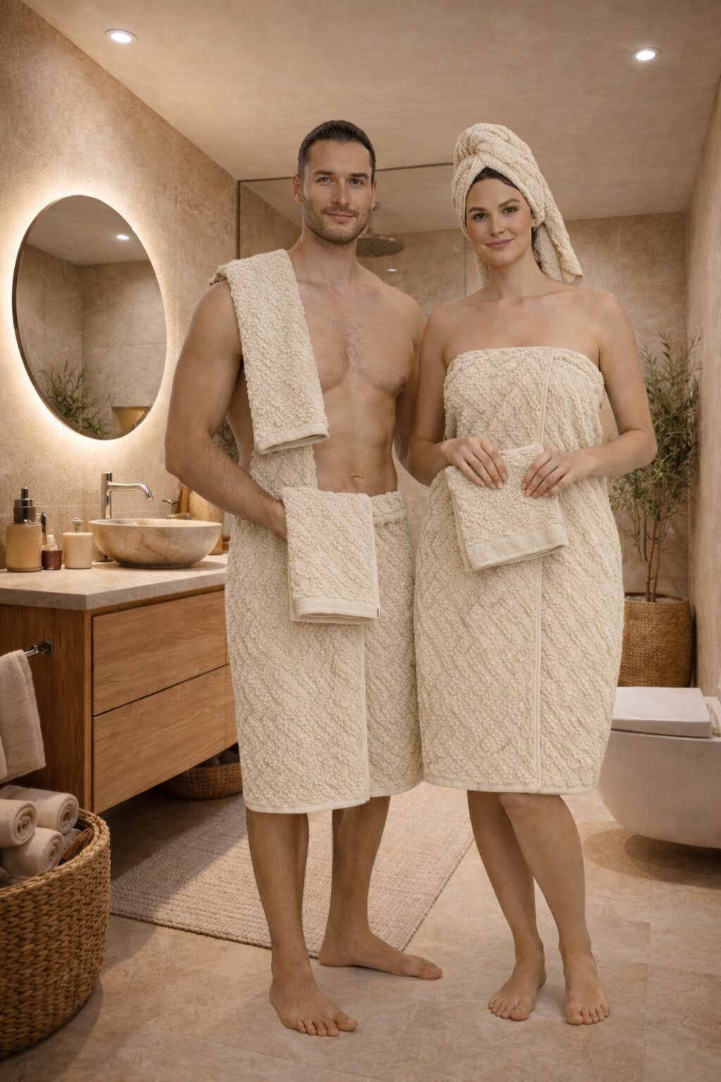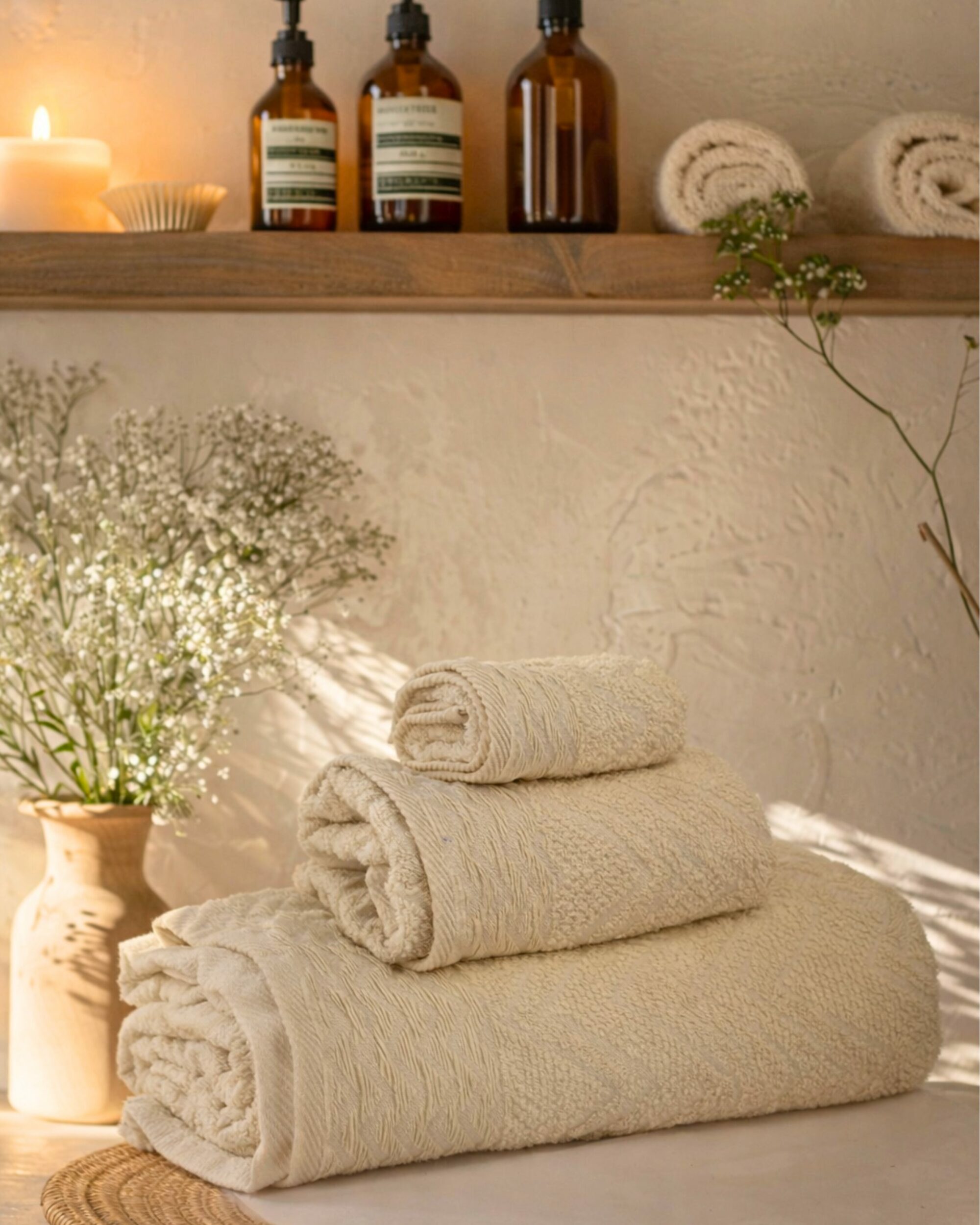 Composé d’une serviette corps 100×150 cm, une serviette cheveux 50×85 cm et une serviette intime 30×50 cm, ce set offre une absorption supérieure, une texture douce et un confort optimal après chaque douche. Parfait pour un usage quotidien, la maison, les voyages ou le trousseau mariage.