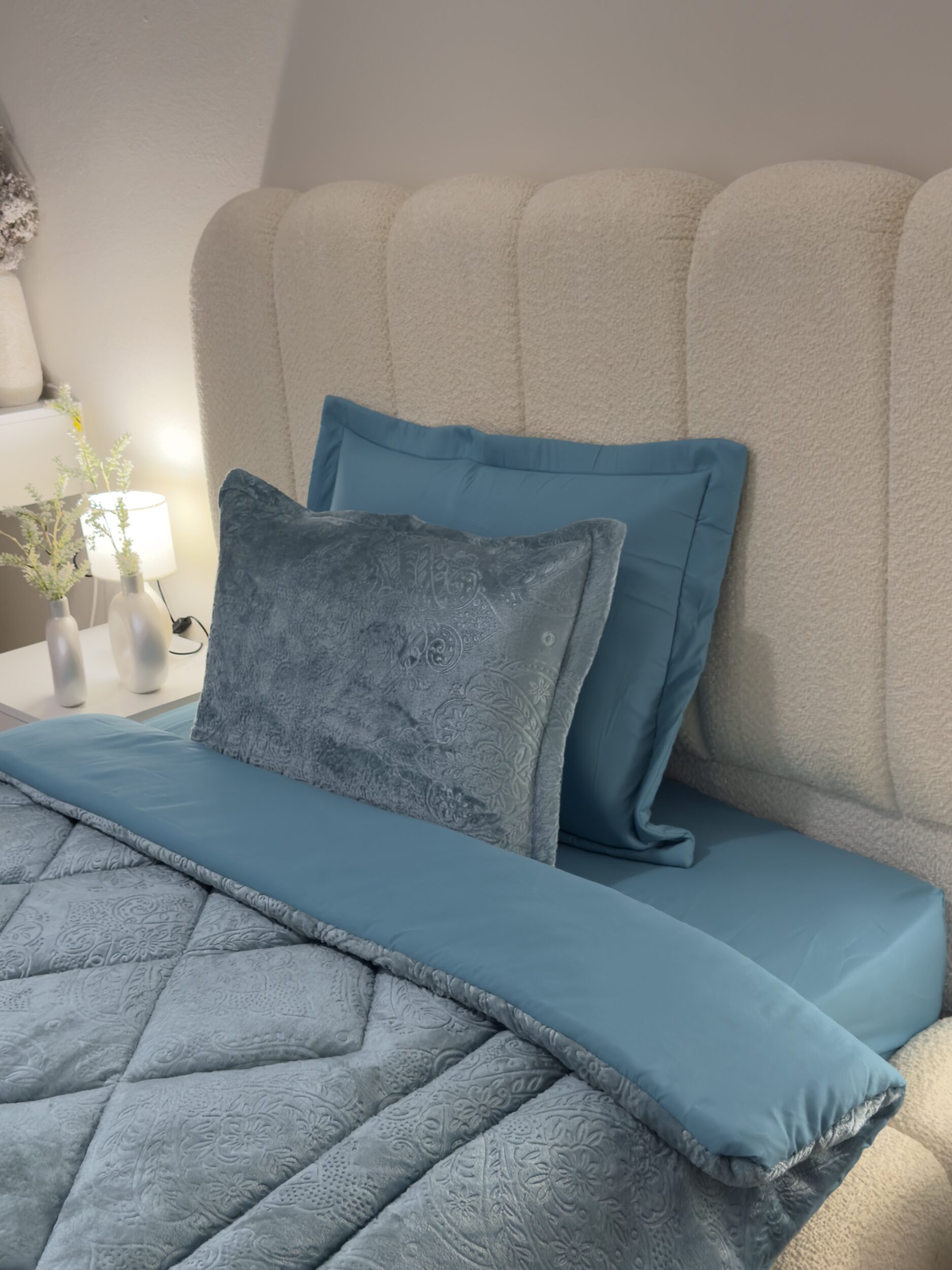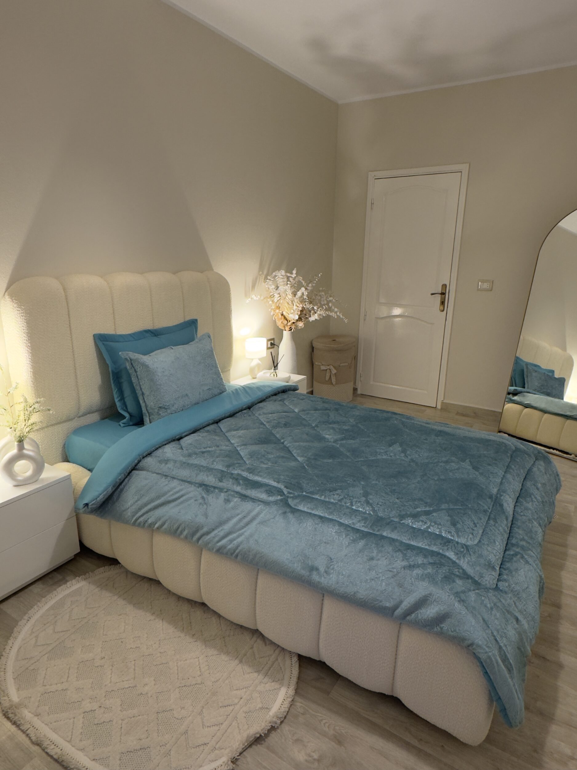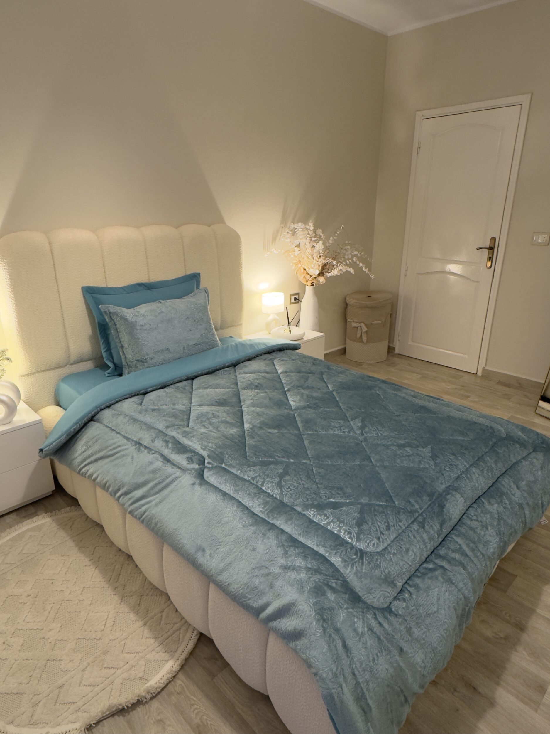 Découvrez notre ensemble de literie haut de gamme, parfait pour les nuits les plus fraîches. La couette double face, en polaire d’un côté et en coton doux de l’autre, s’adapte à toutes vos envies. Elle est accompagnée d’une housse de lit en coton, de deux taies d’oreiller en coton matelassé et de deux taies d’oreiller en polaire douillette.