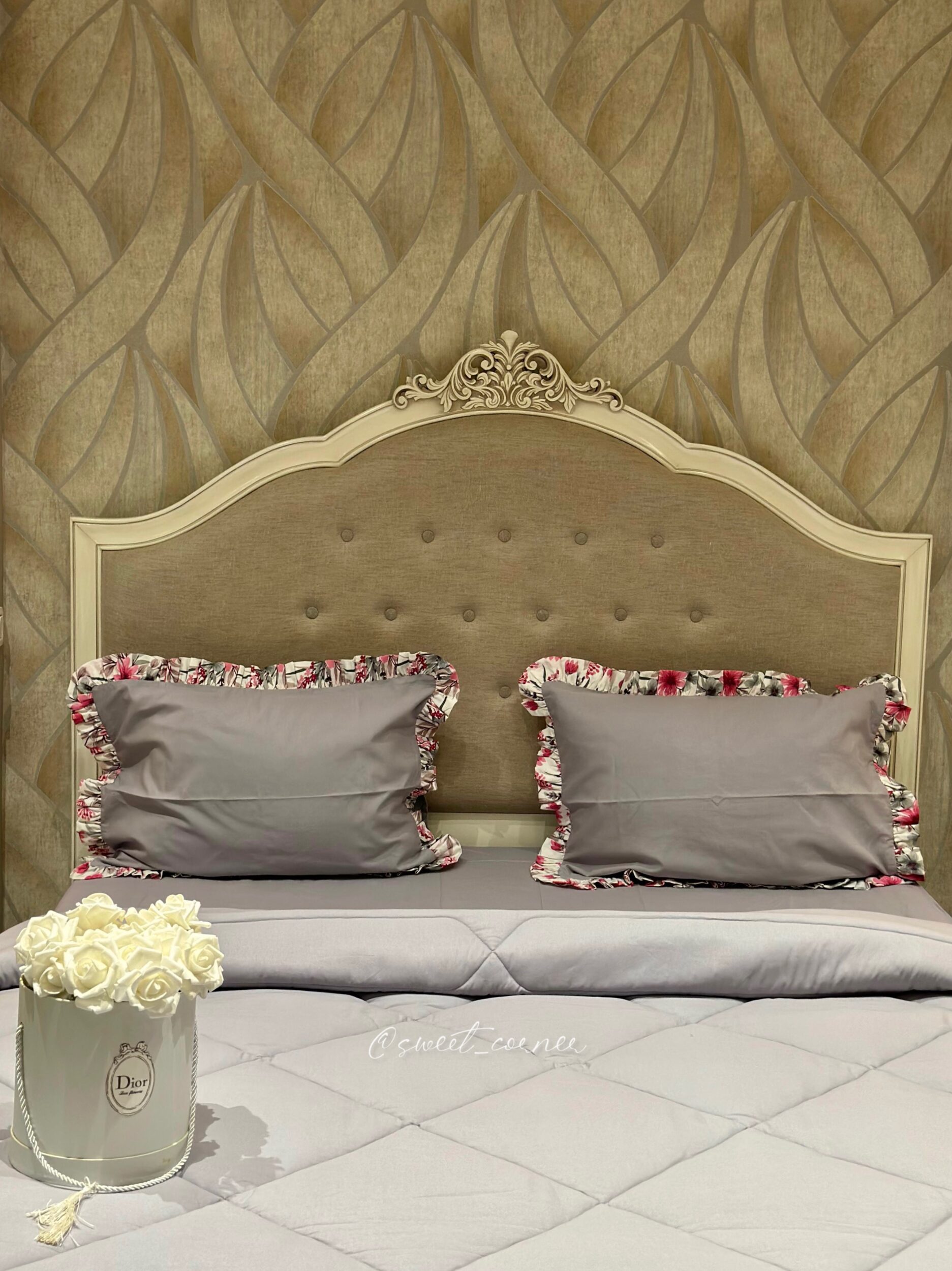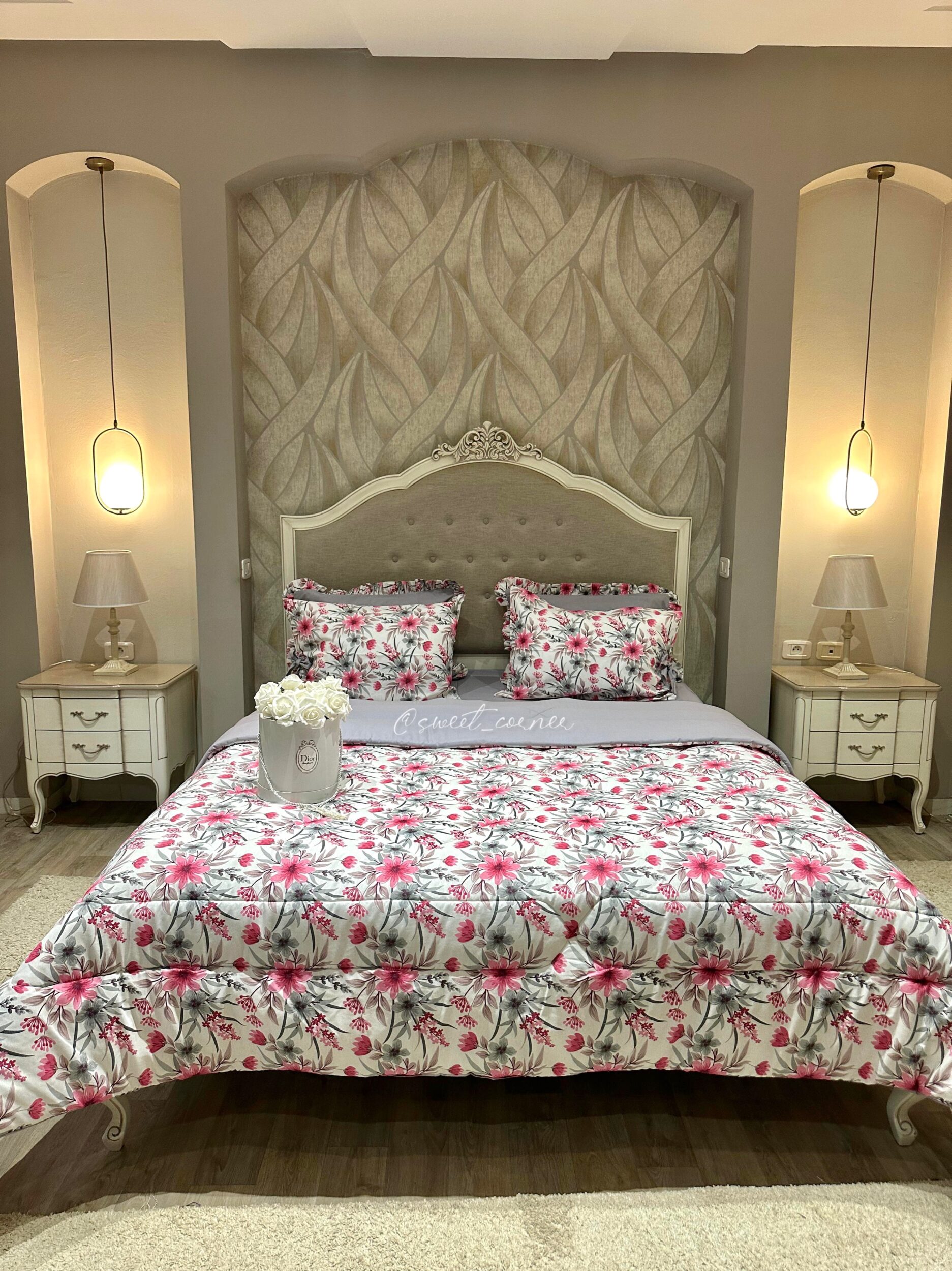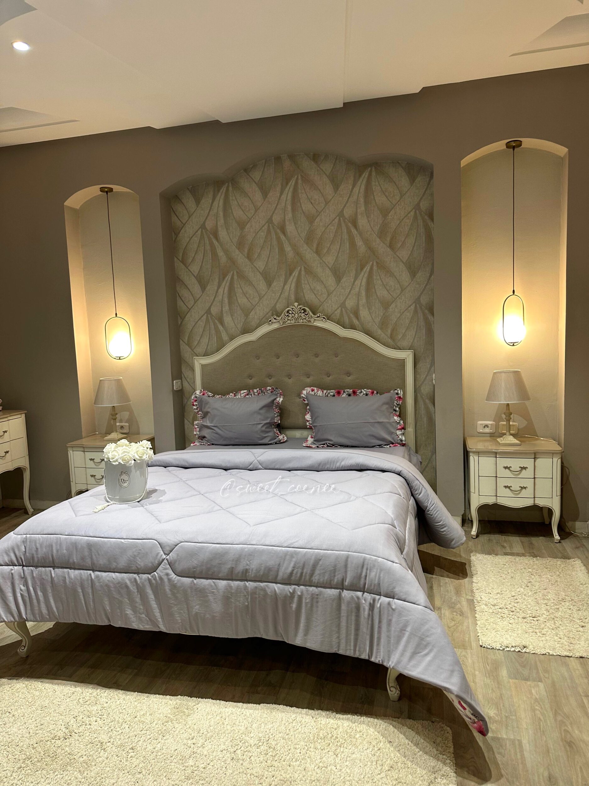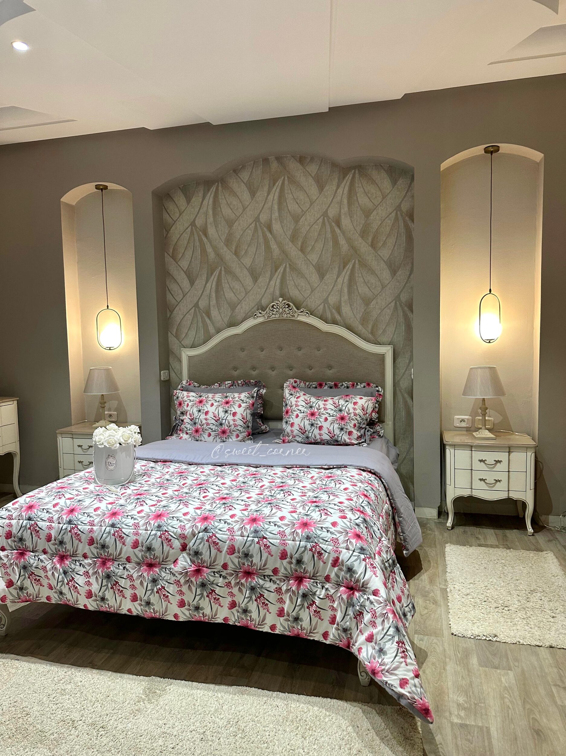 - une couette king size 2.6m x 2.4m double face (fleurie et gris uni) pour s’adapter à toutes les saisons,