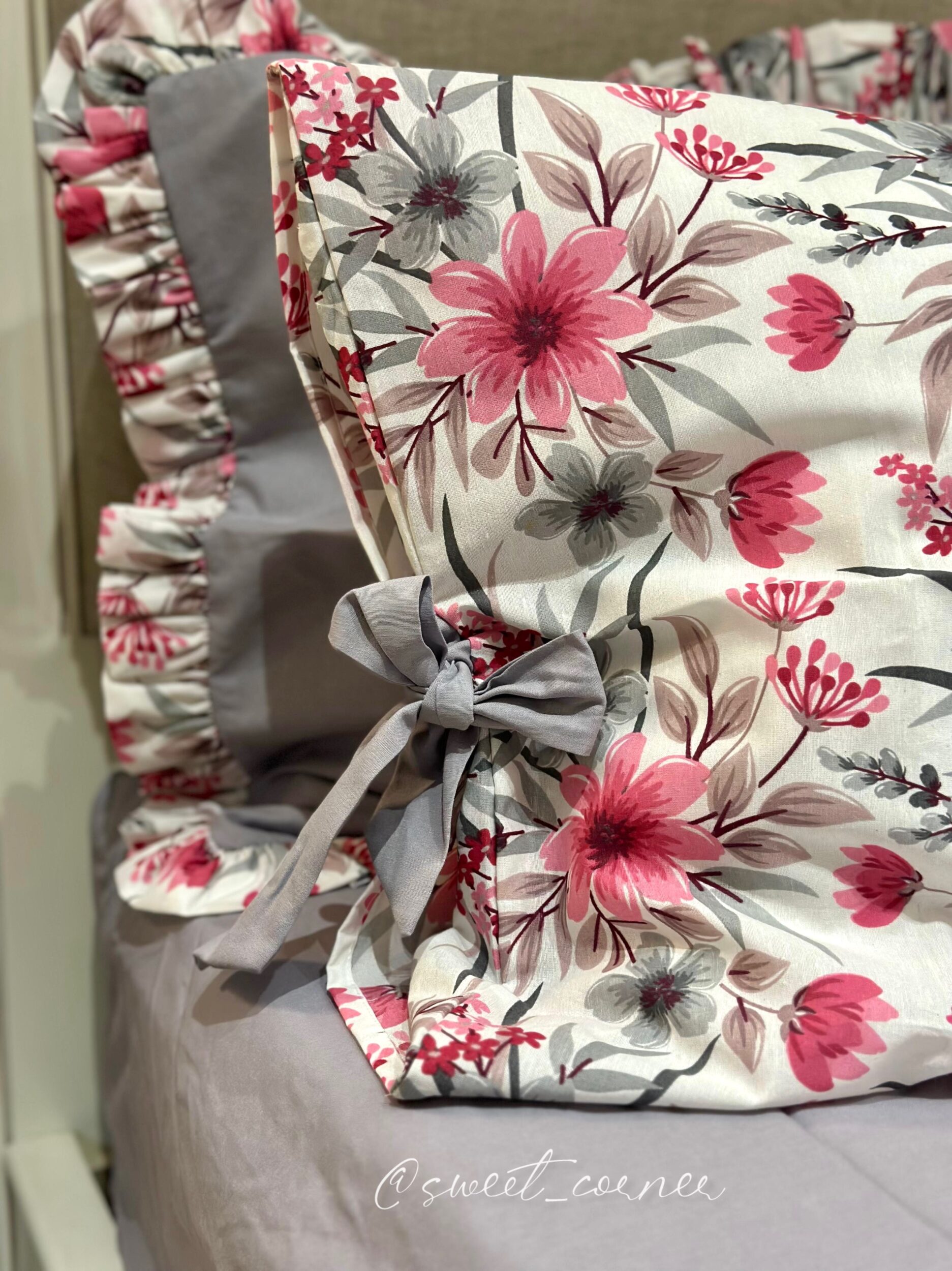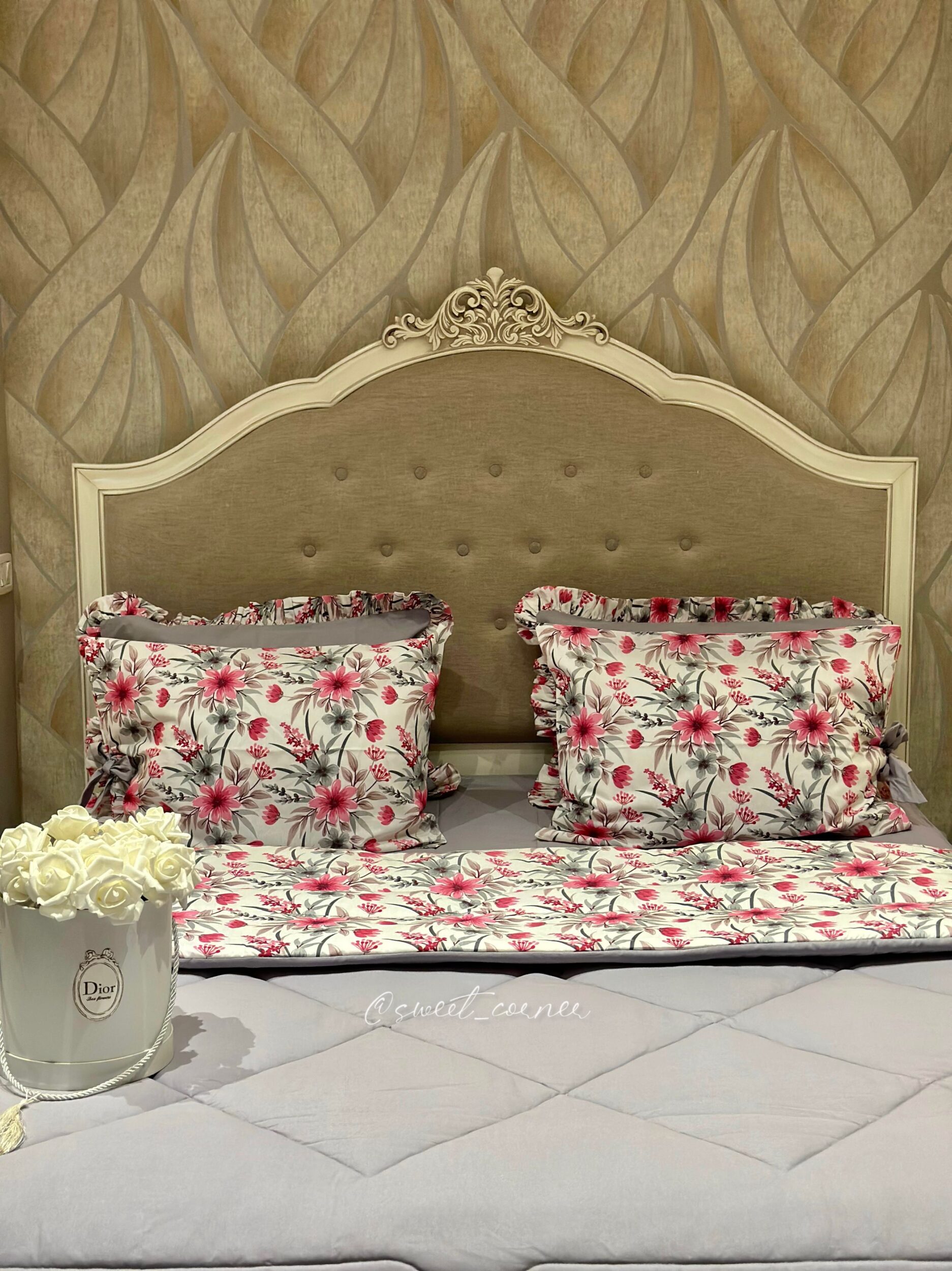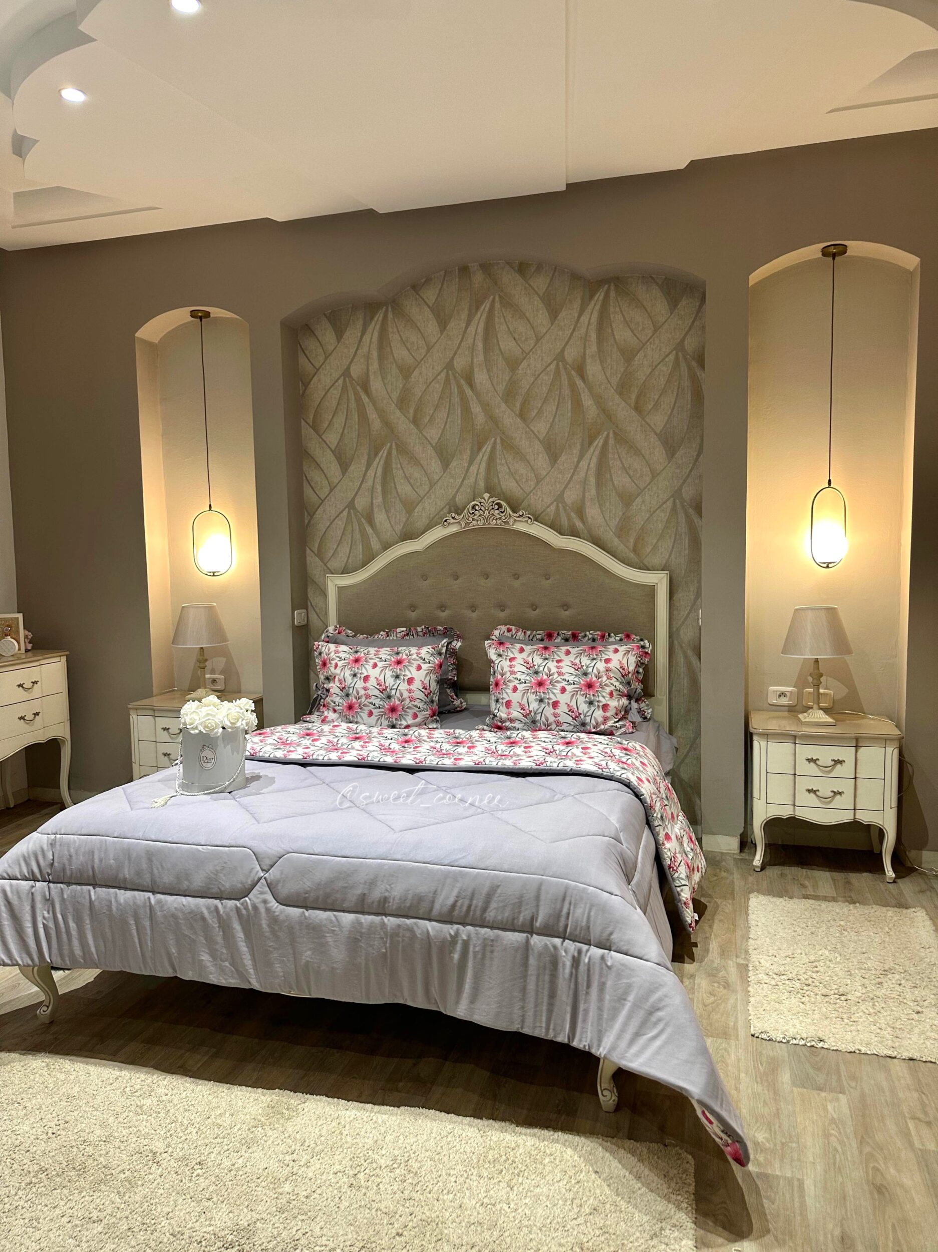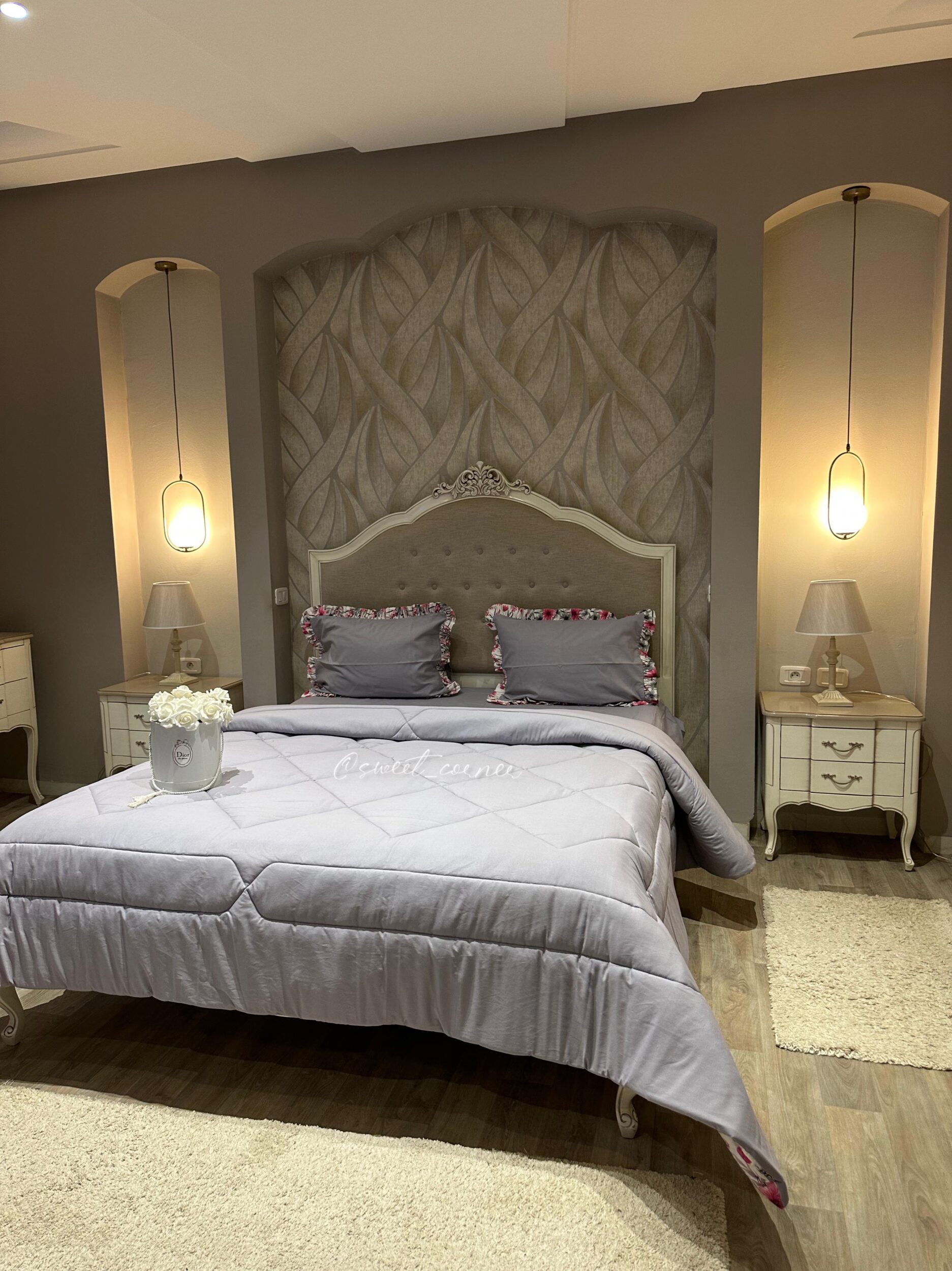 - une couette king size 2.6m x 2.4m double face (fleurie et gris uni) pour s’adapter à toutes les saisons,