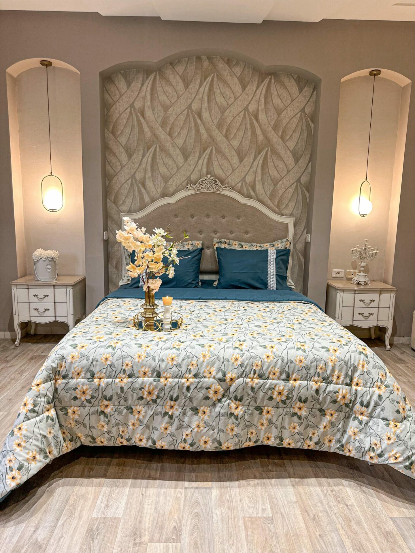 La couette 240×260 cm offre un recto vert uni pour un style épuré et un verso fleuri pour une touche de romantisme.