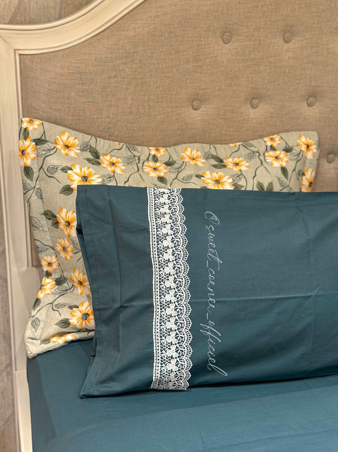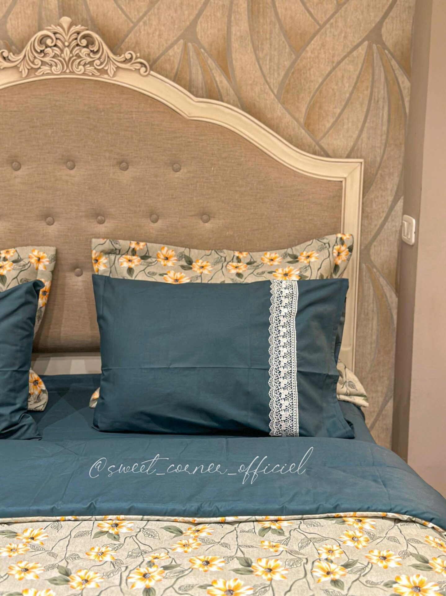 2 taies d’oreiller vertes 50×70 cm,agrémentées de dentelle, apportent une note délicate.