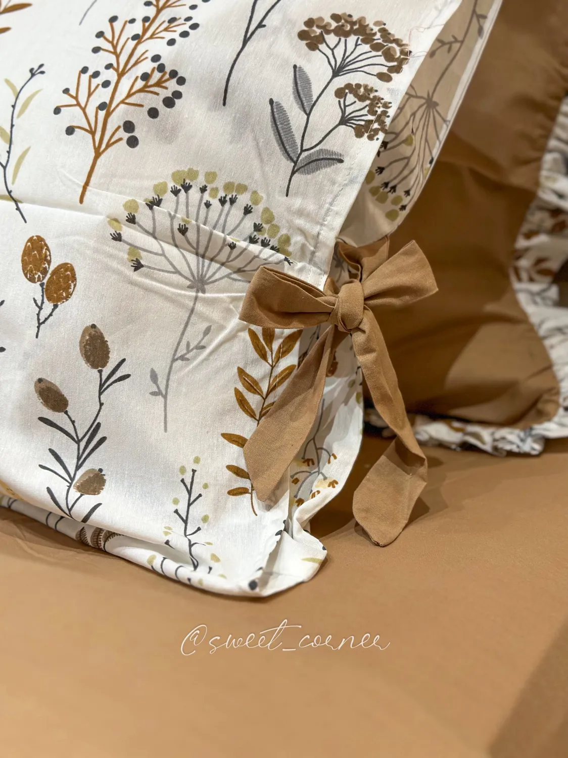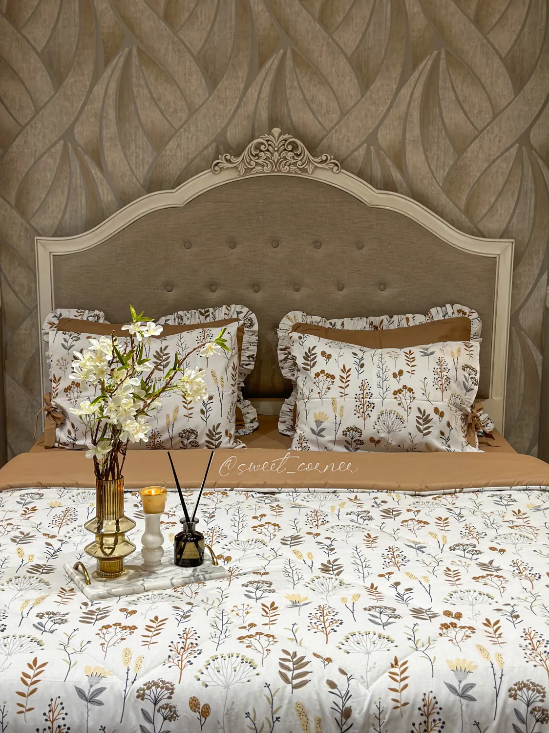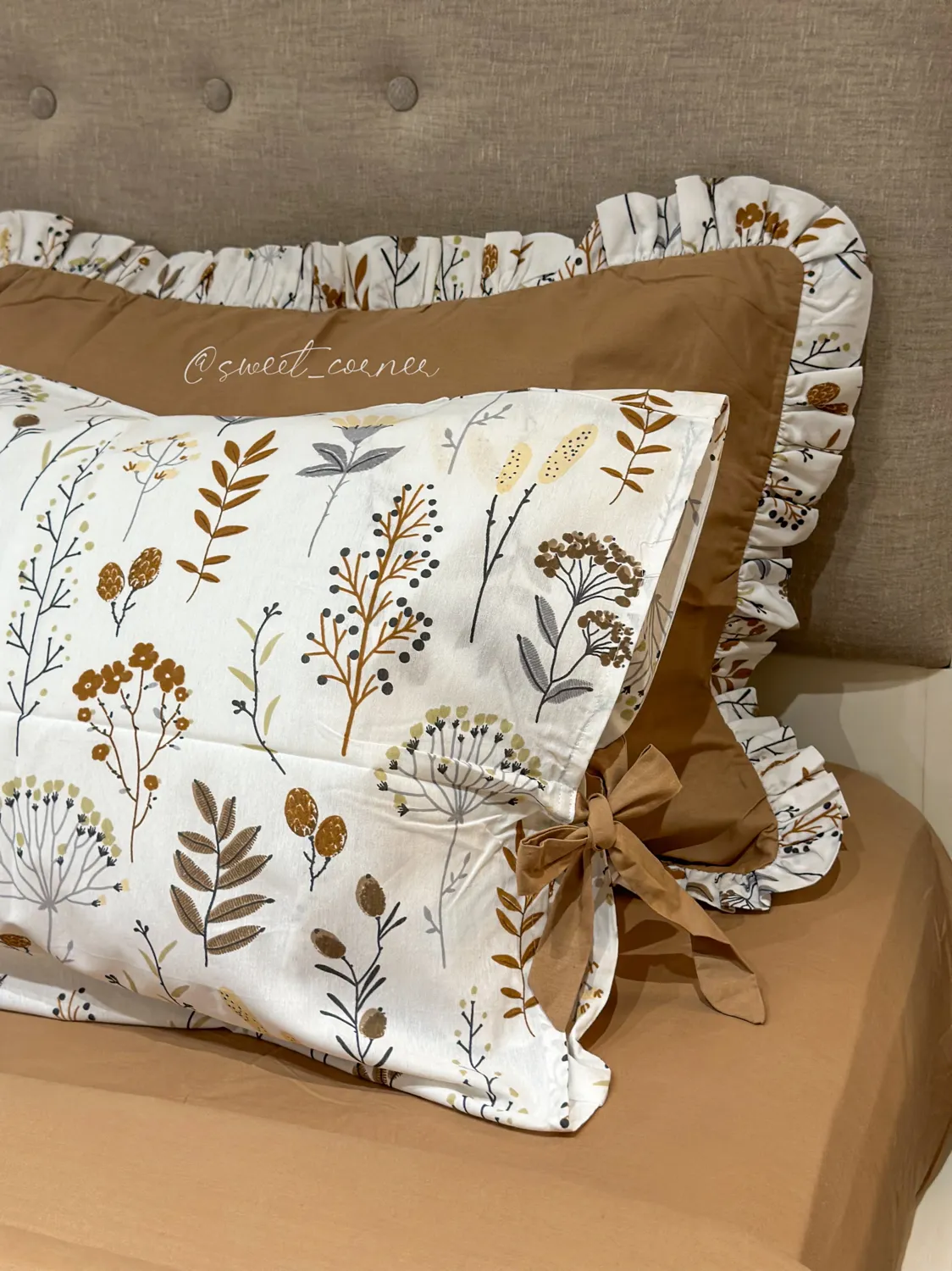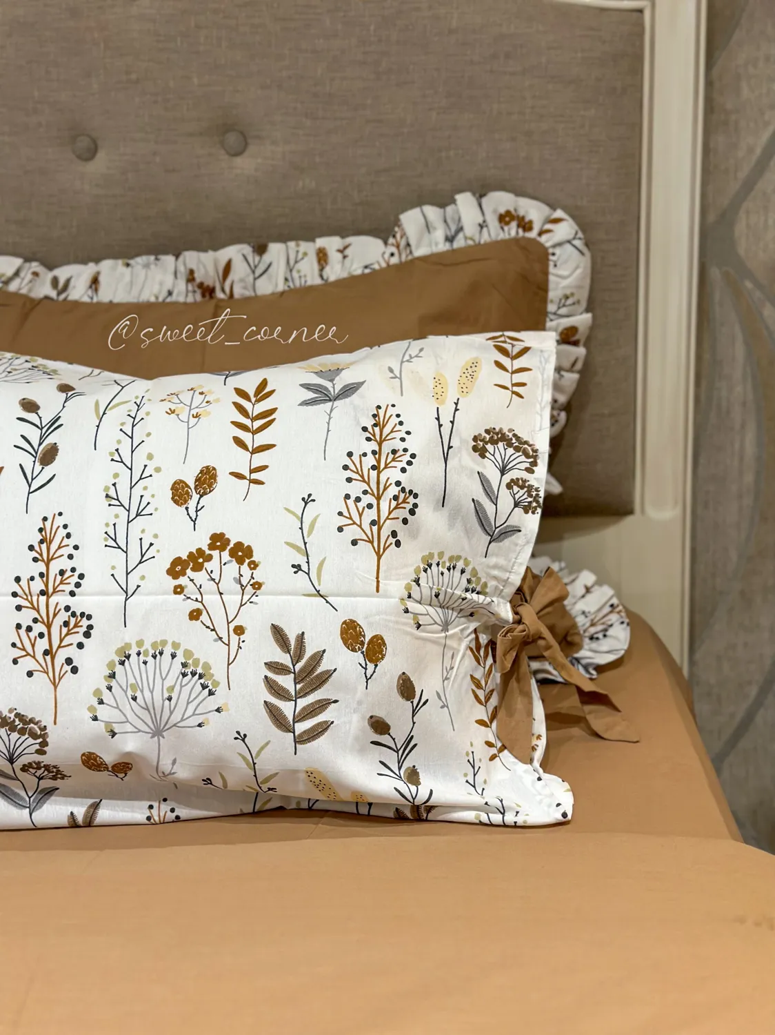 2 taies d’oreiller caramel 50×70 cm, agrémentées de volant apportent une note délicate.