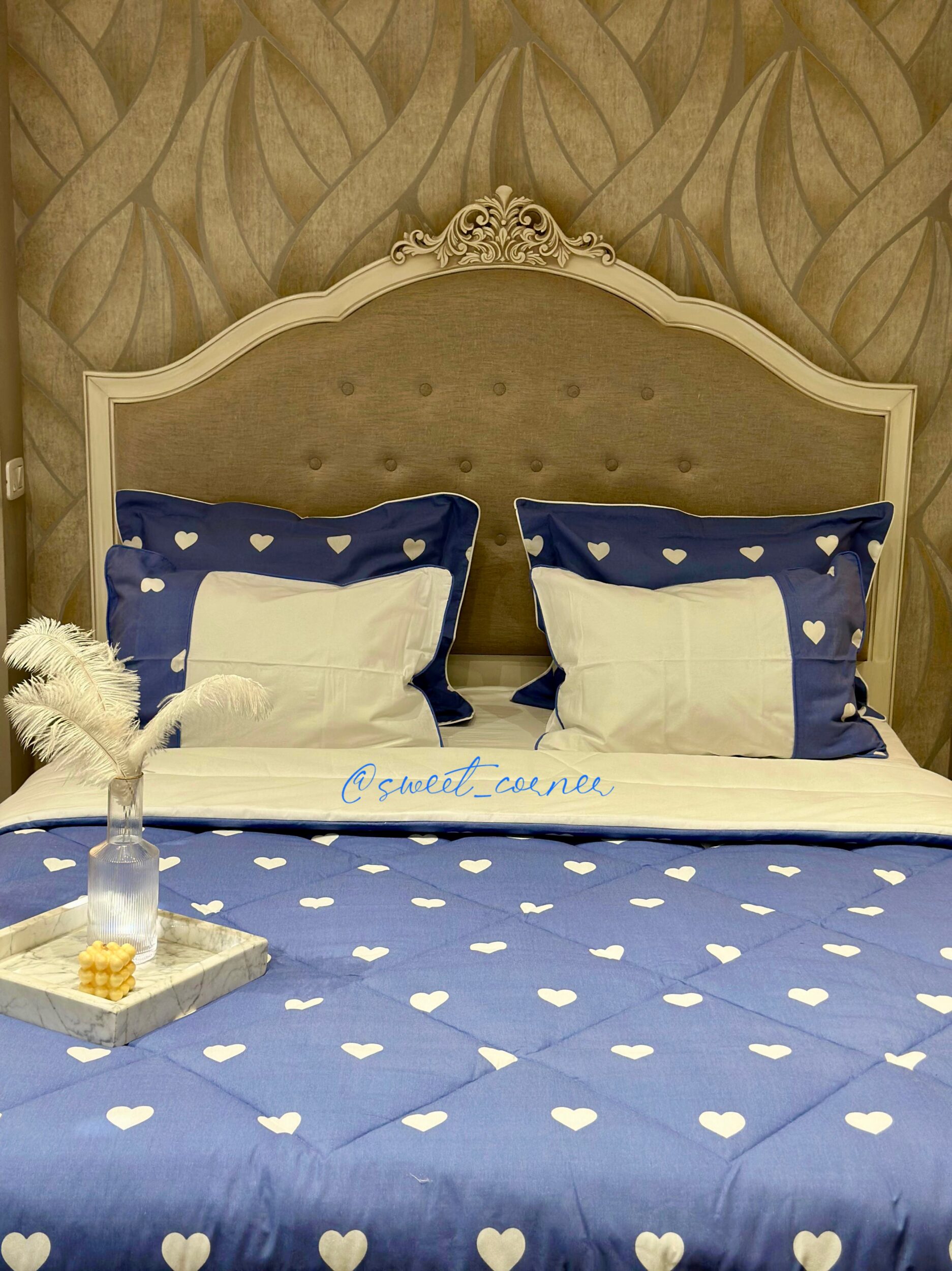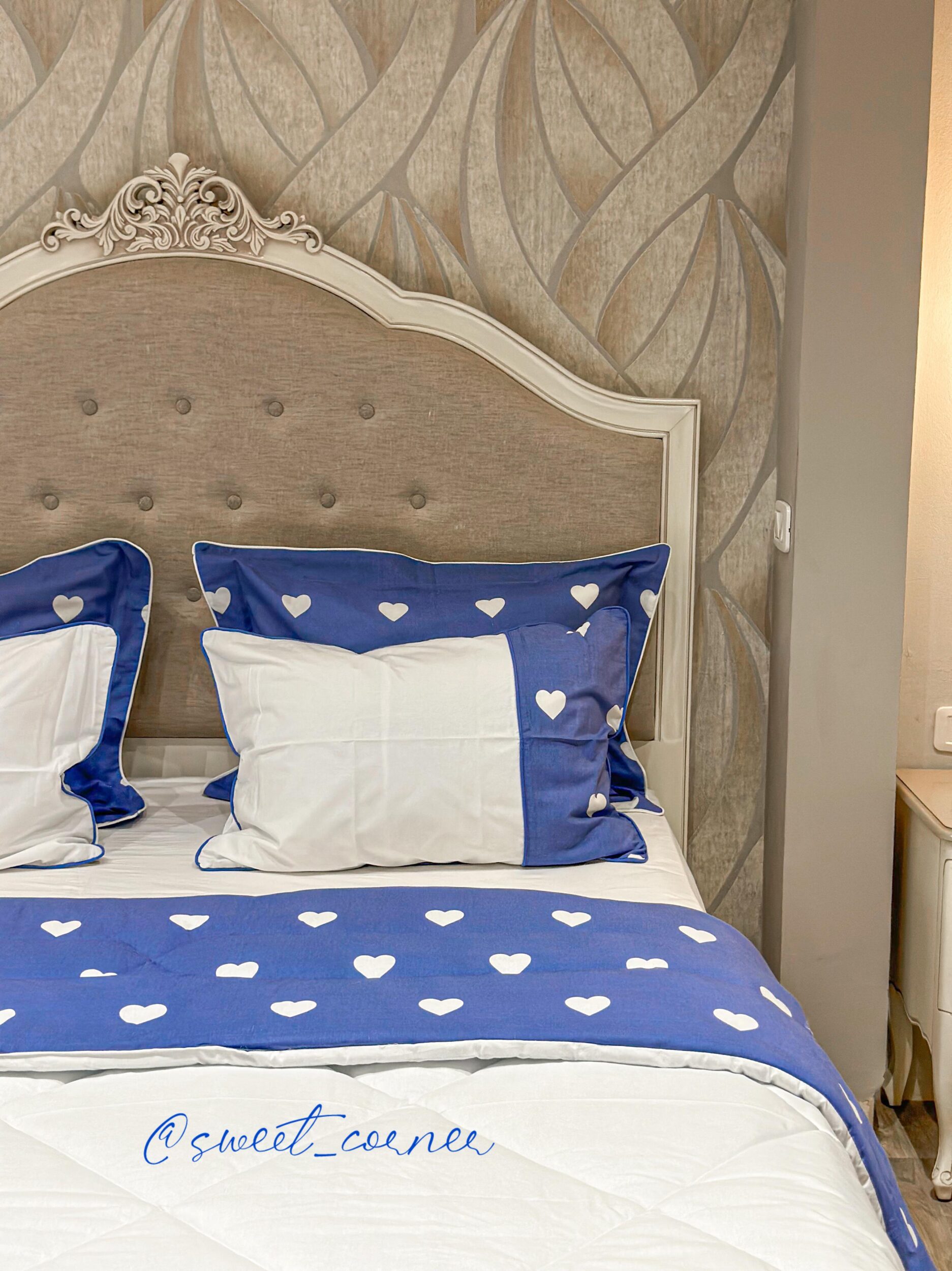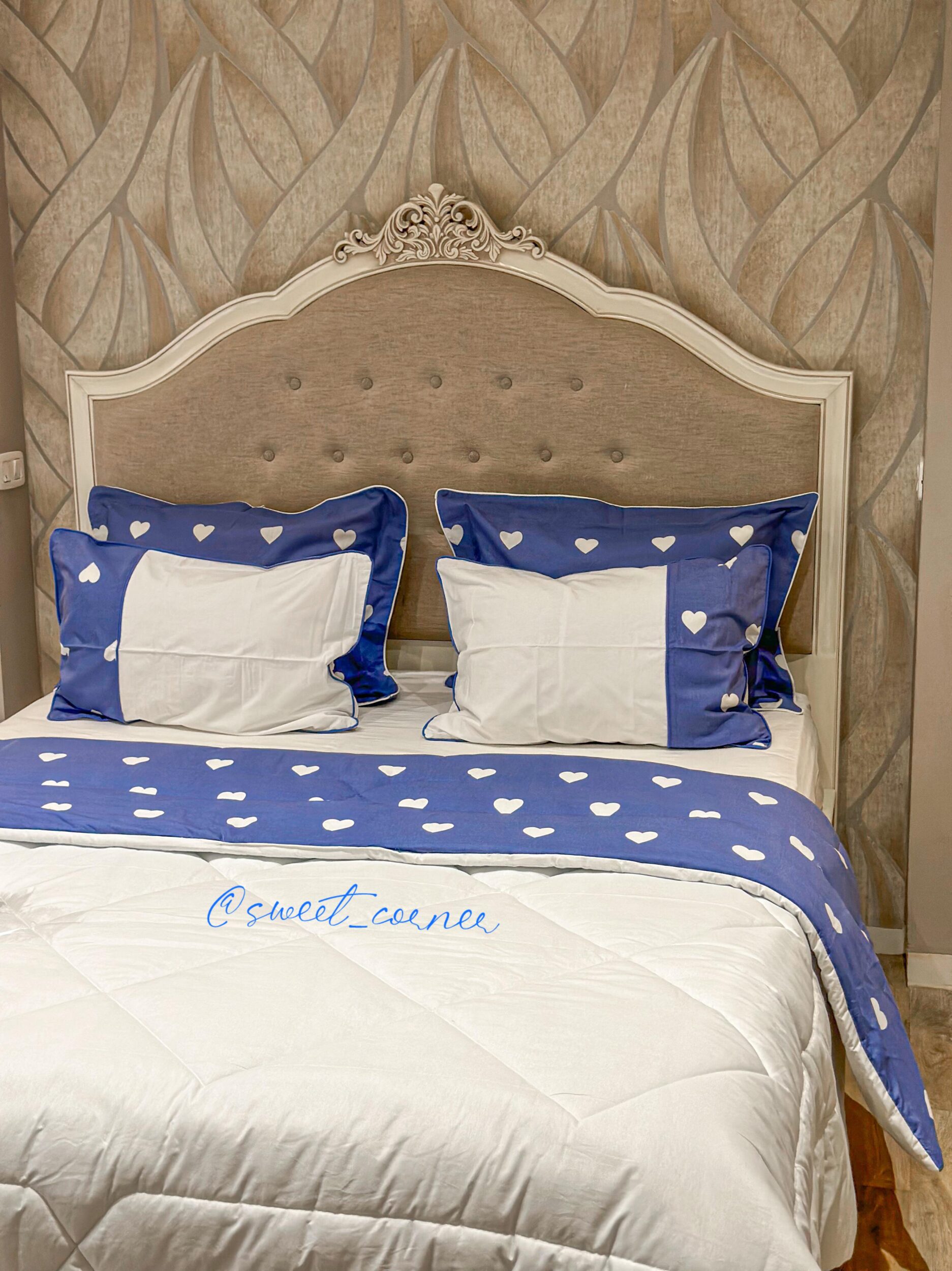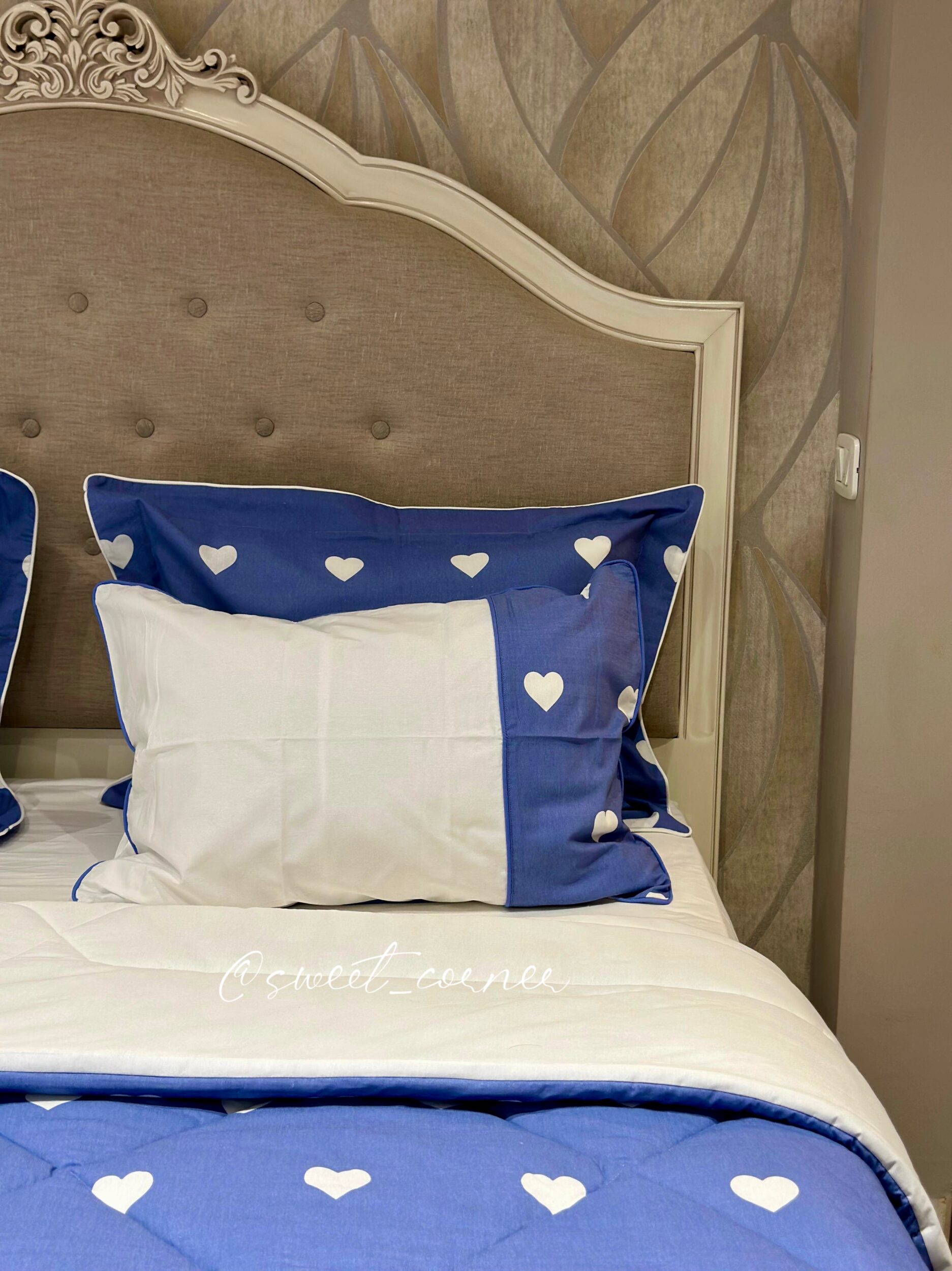 Parure de lit Saphir Double Face : Craquez pour notre parure de lit réversible en coton doux et respirant. Une face blanche intemporelle et une face bleu rehaussée de cœurs blancs pour une touche romantique.