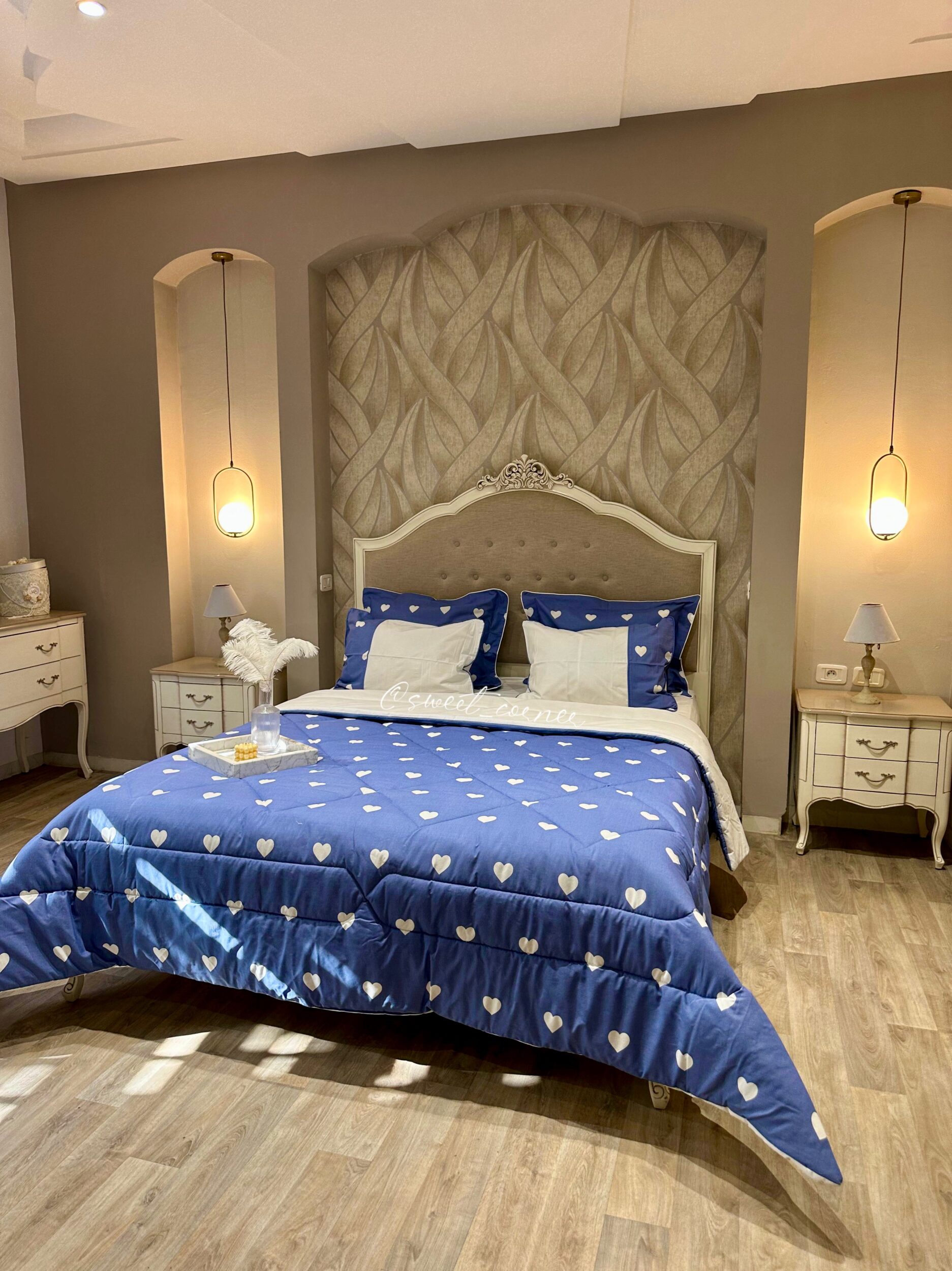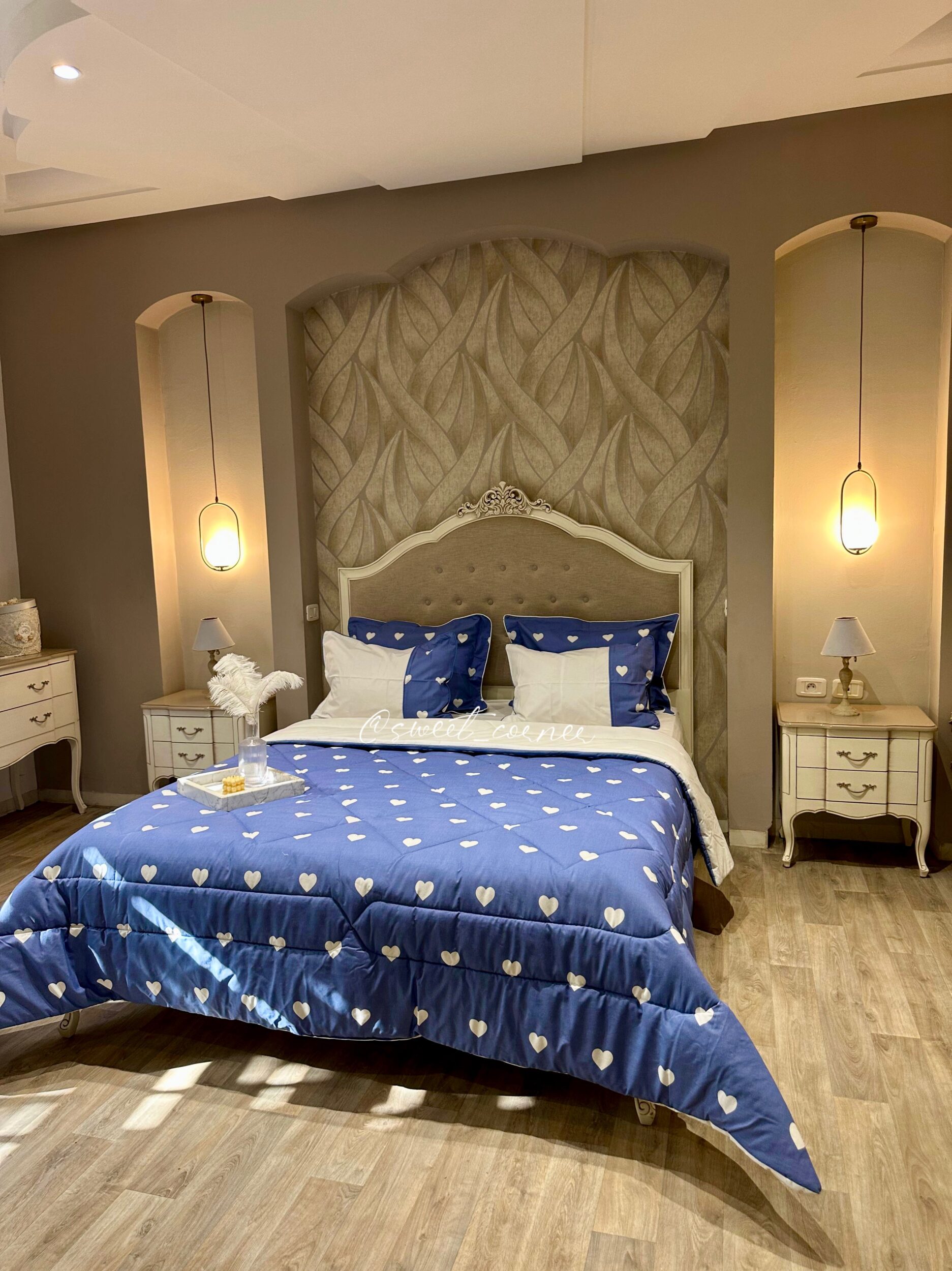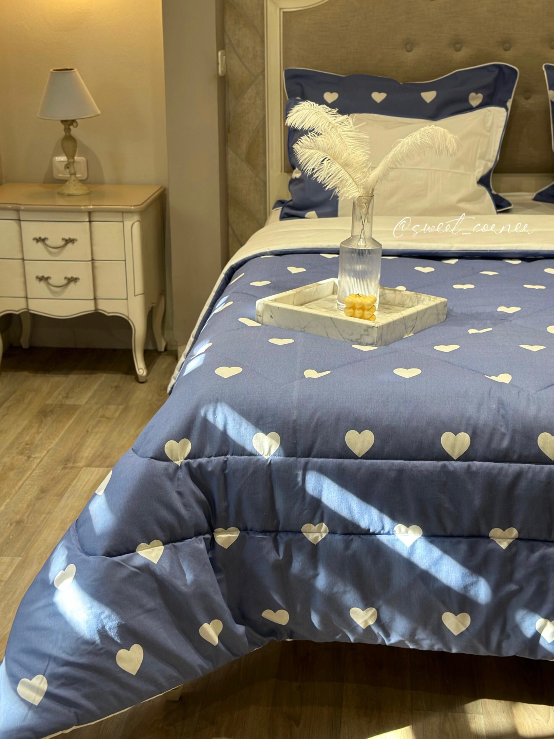 Parure de lit Saphir Double Face : Craquez pour notre parure de lit réversible en coton doux et respirant. Une face blanche intemporelle et une face bleu rehaussée de cœurs blancs pour une touche romantique.