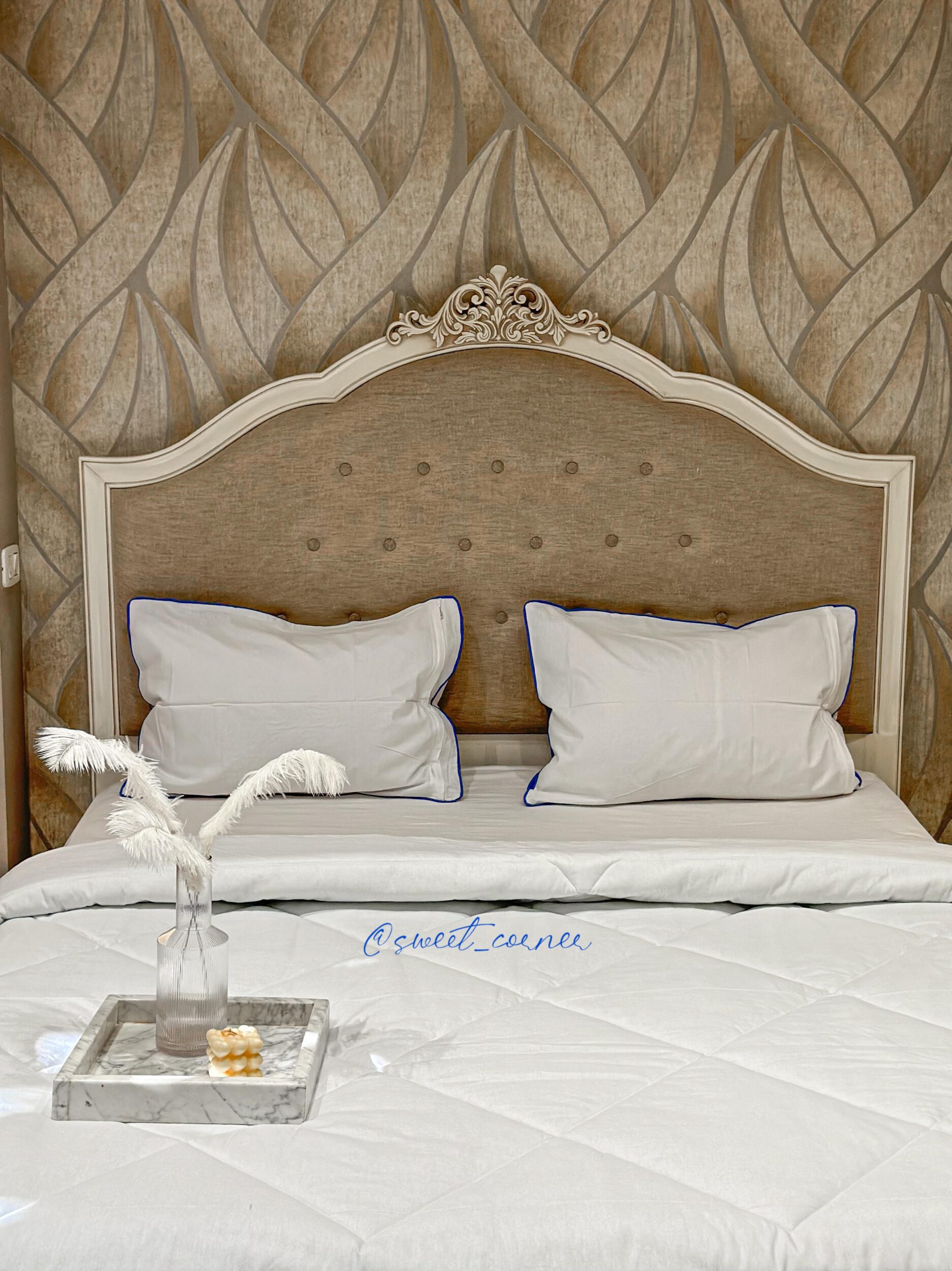 - 2 taies d’oreiller 50×70 cm (blanc avec biais bleu)
