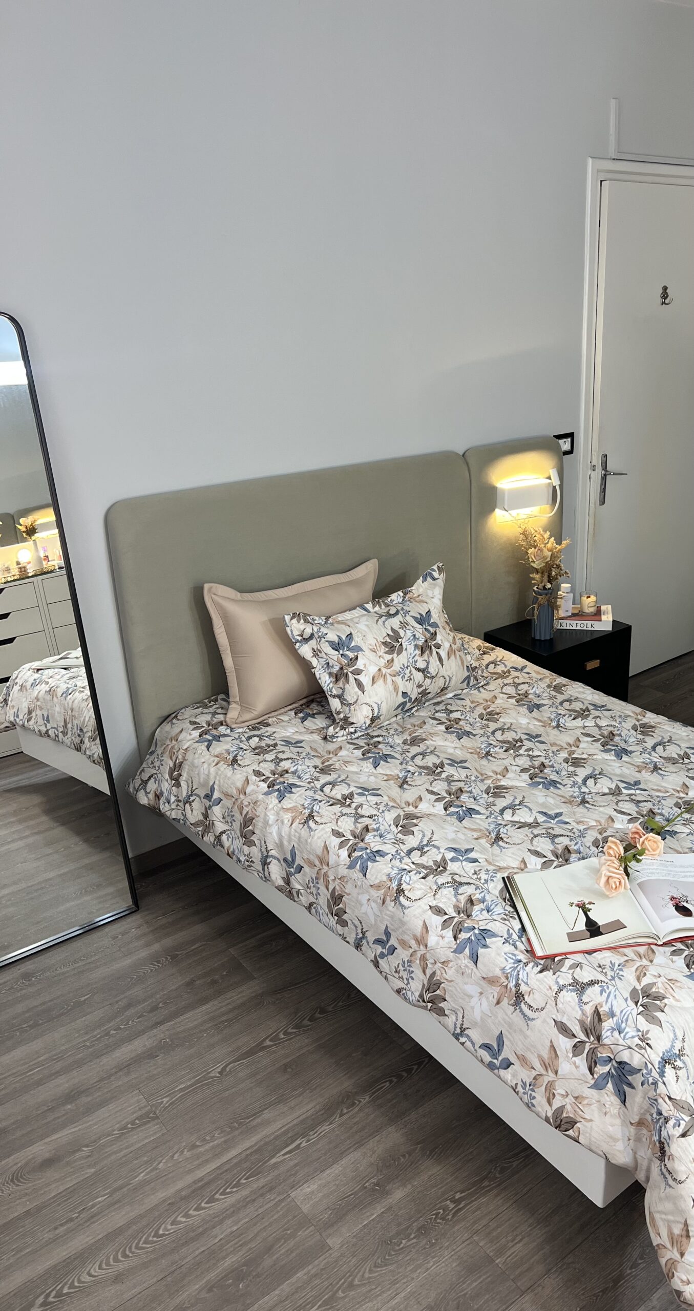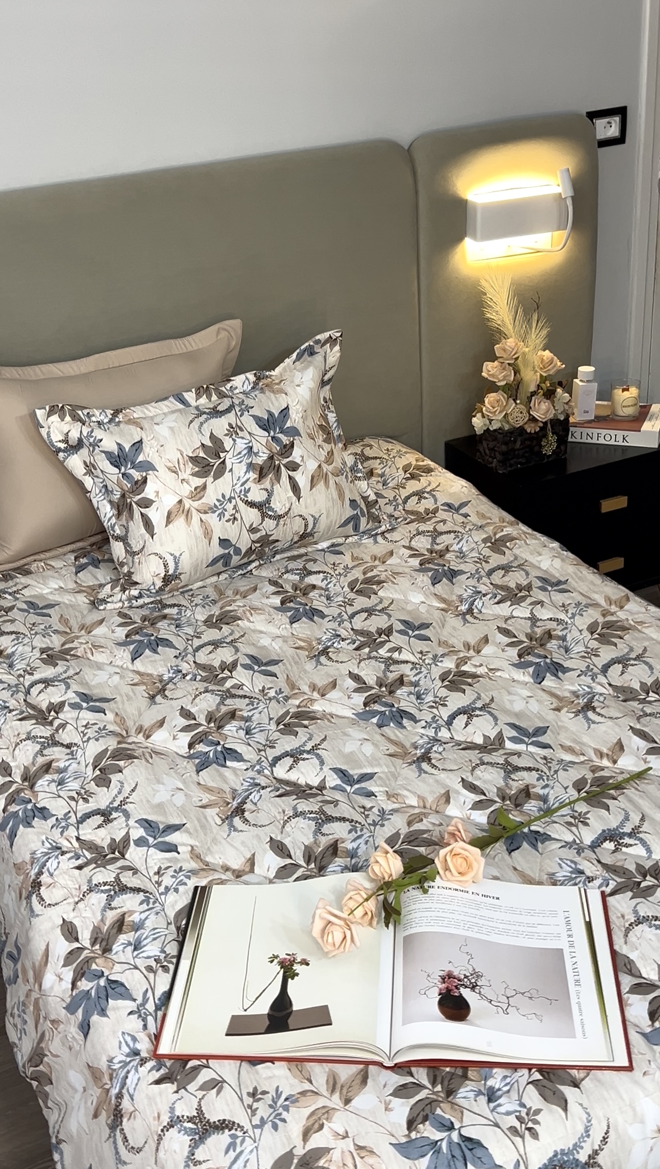 - Couette double face : 2.2 m x 1.7 m — un côté imprimé fleuri pour une ambiance printanière, l’autre uni pour un style sobre et intemporel.