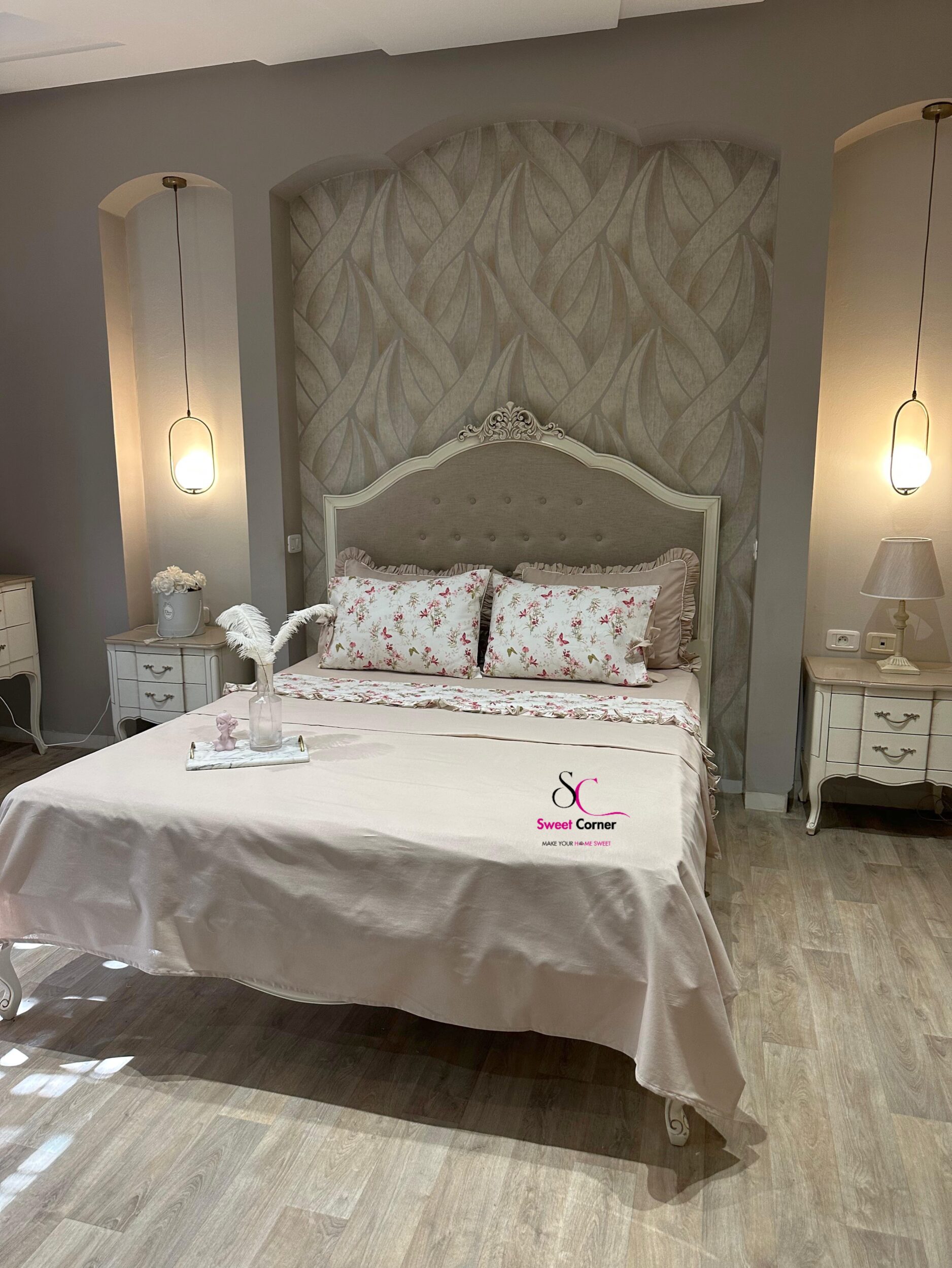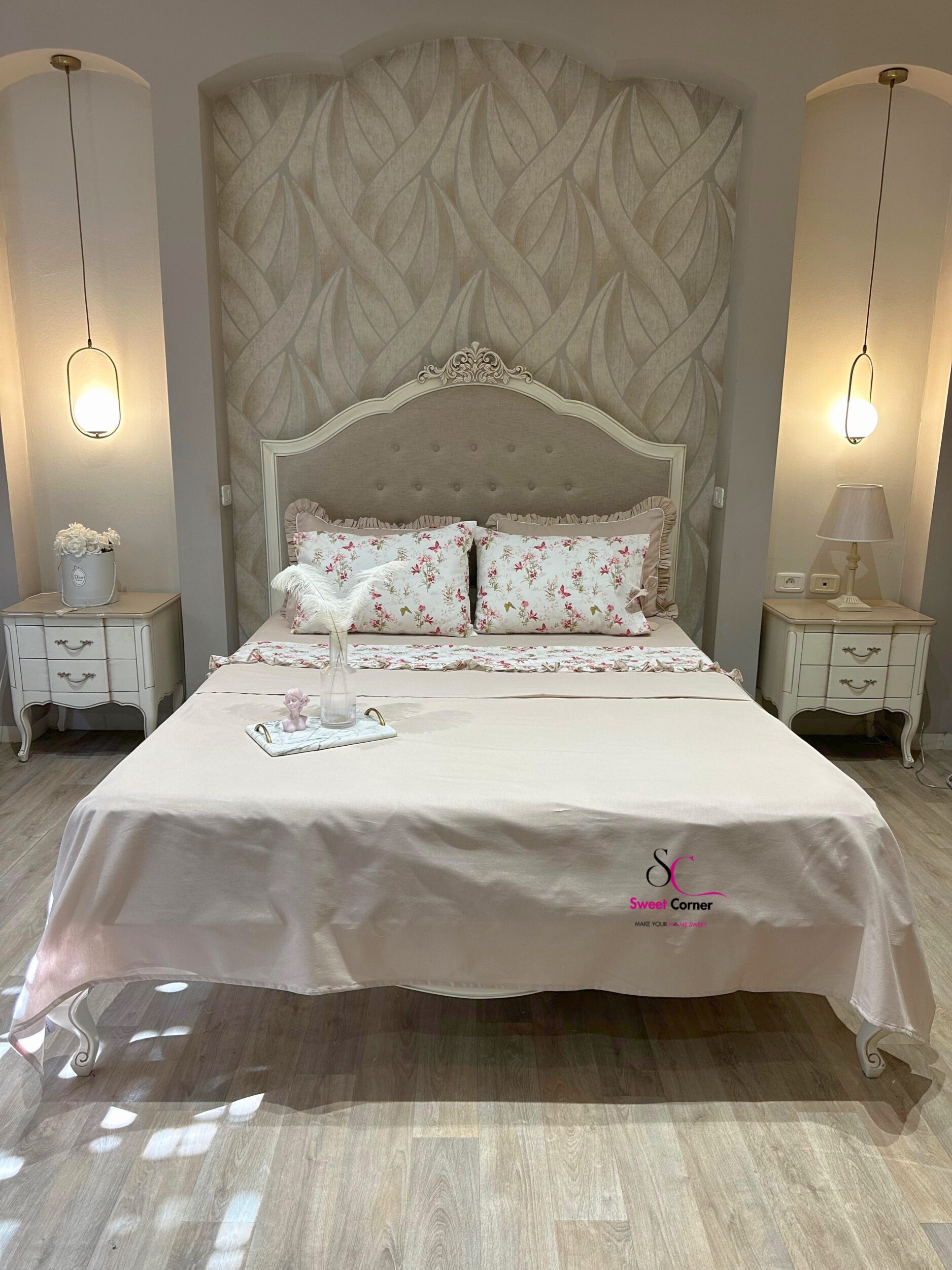 - 1 drap plat en coton uni avec un revers fleuri (230×250 cm) : léger et respirant, parfait pour une utilisation toute saison.