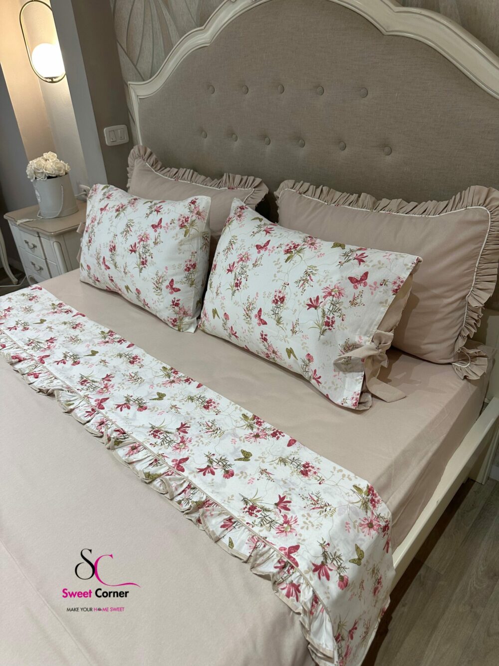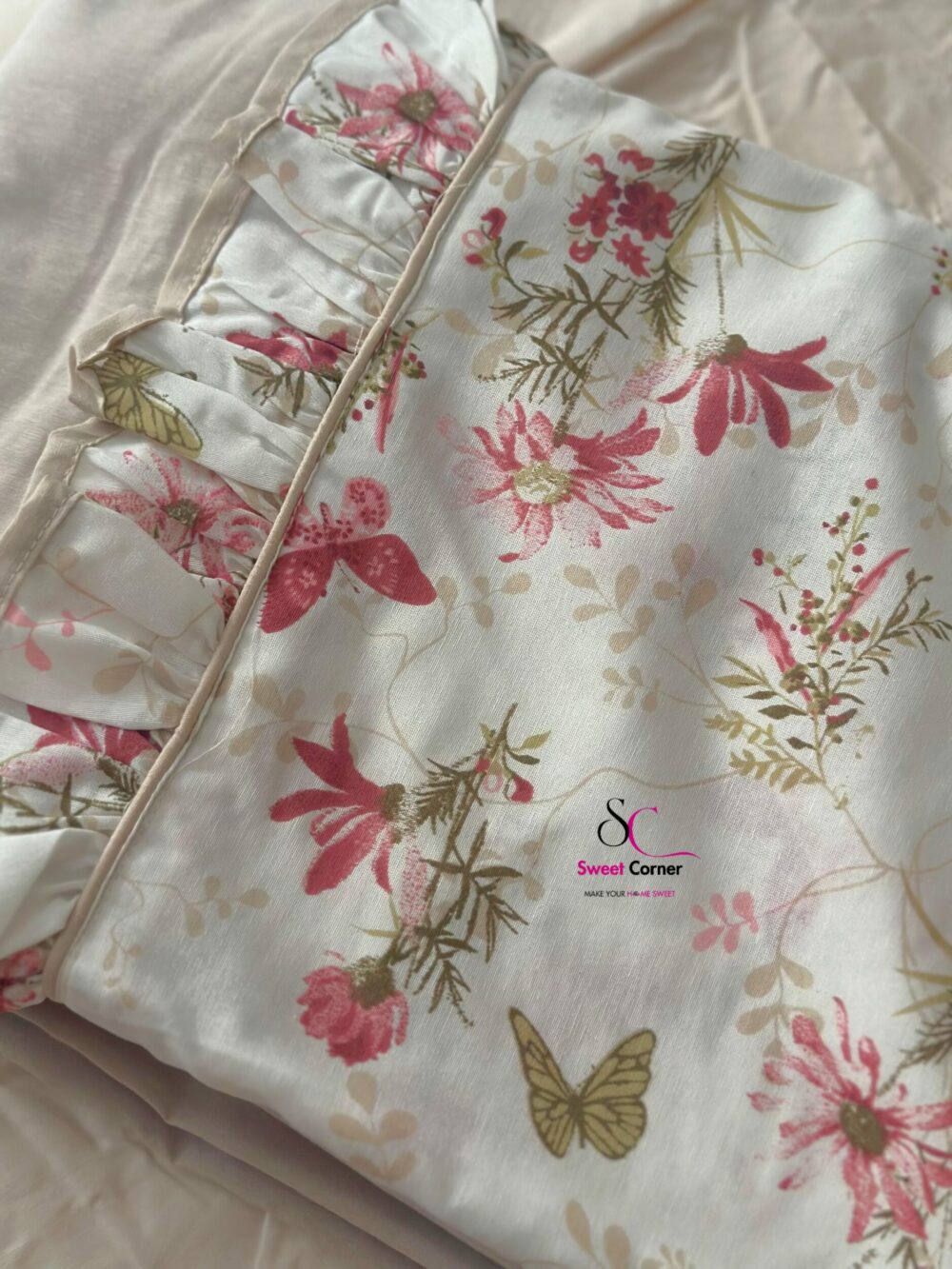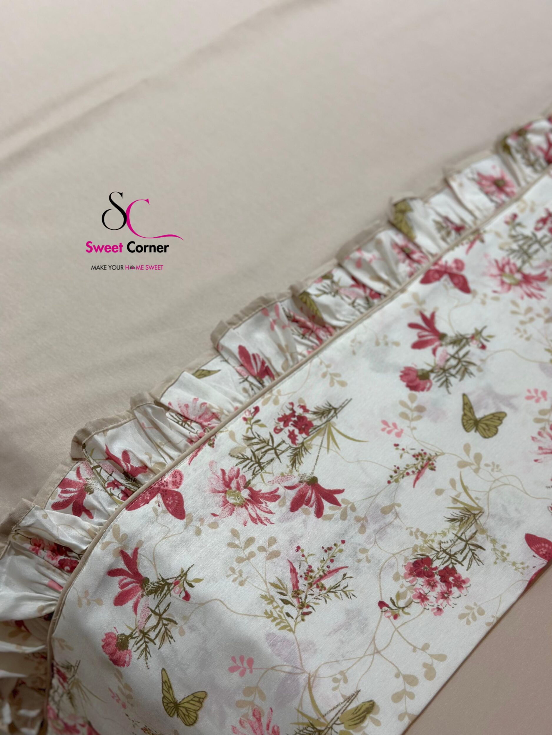 Apportez élégance et douceur à votre chambre avec cette parure de lit au motif floral raffiné. Son fond beige clair sublimé de fleurs roses et dorées crée une ambiance romantique et apaisante. La finition à volants plissés ajoute une touche chic et sophistiquée.