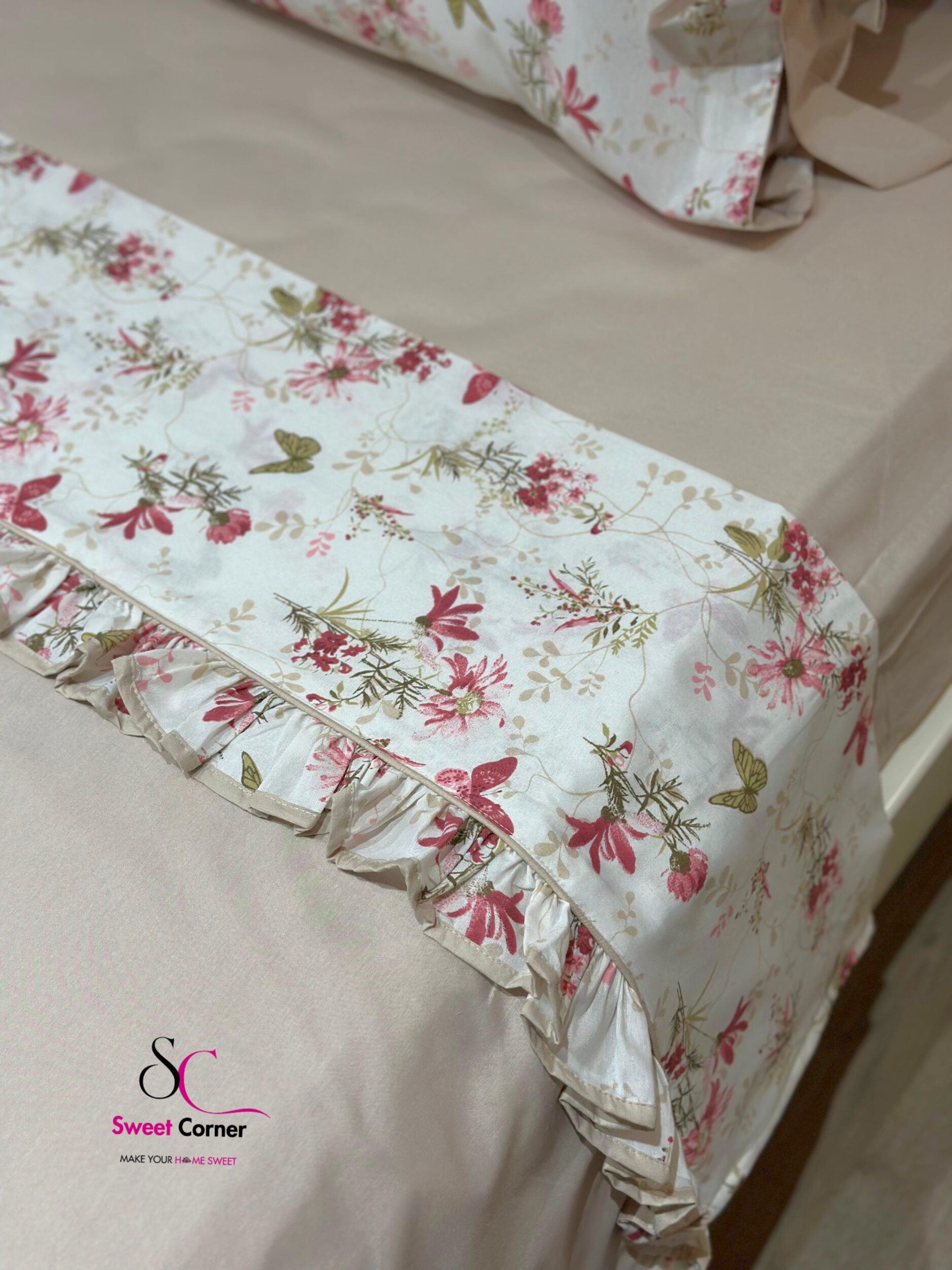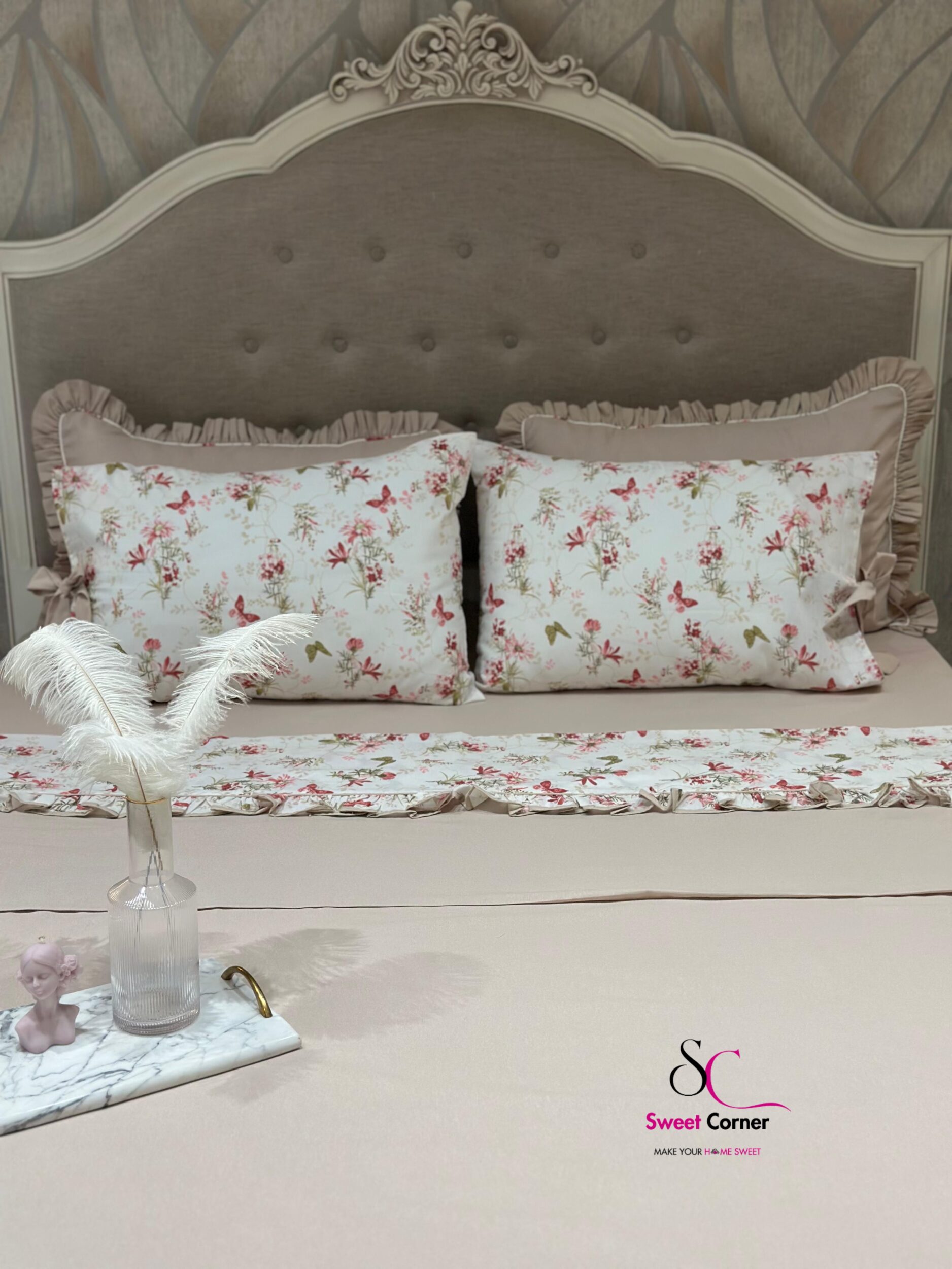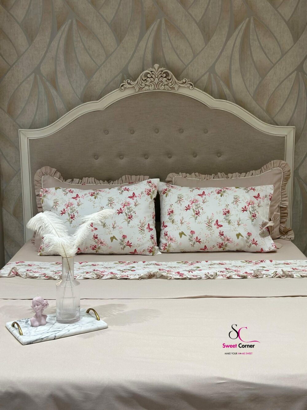 Apportez élégance et douceur à votre chambre avec cette parure de lit au motif floral raffiné. Son fond beige clair sublimé de fleurs roses et dorées crée une ambiance romantique et apaisante. La finition à volants plissés ajoute une touche chic et sophistiquée.