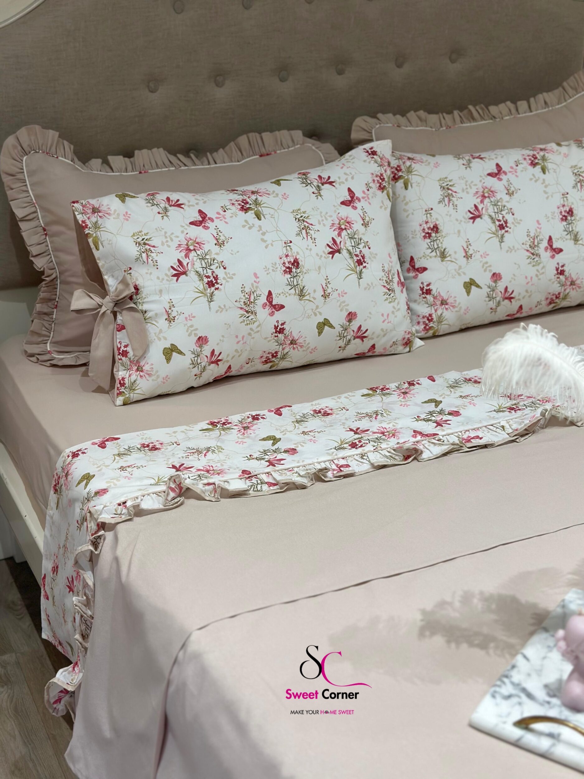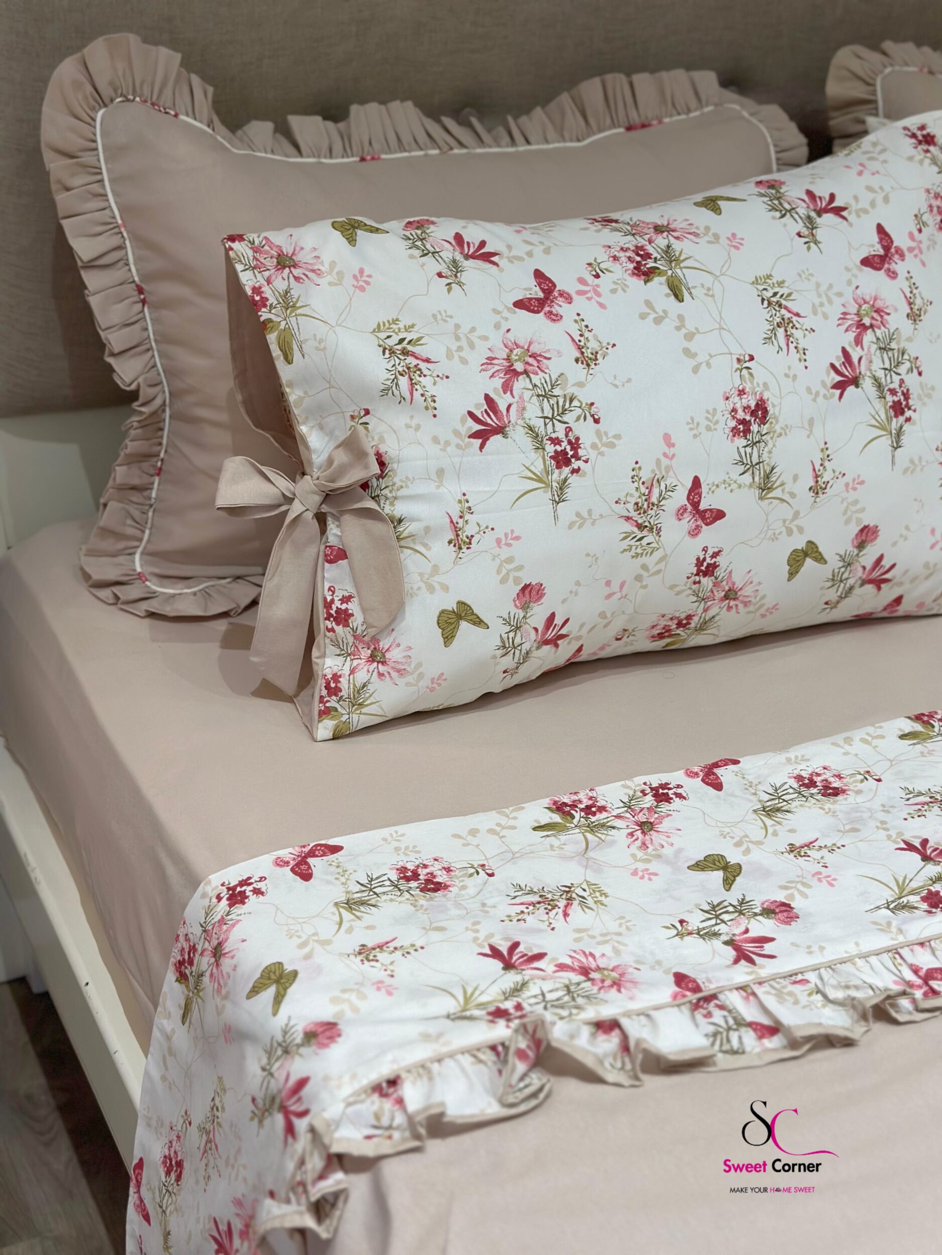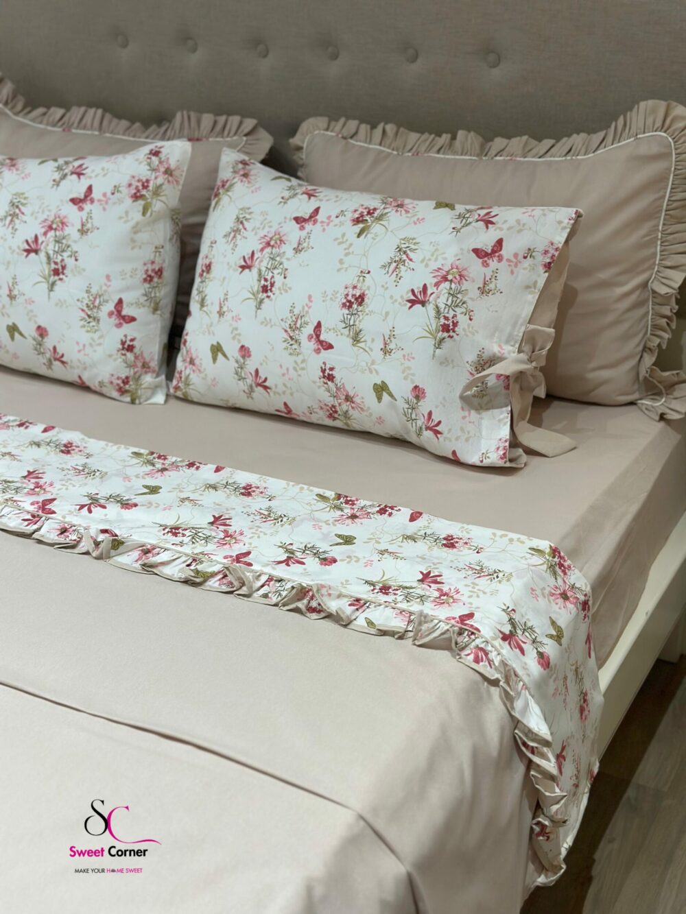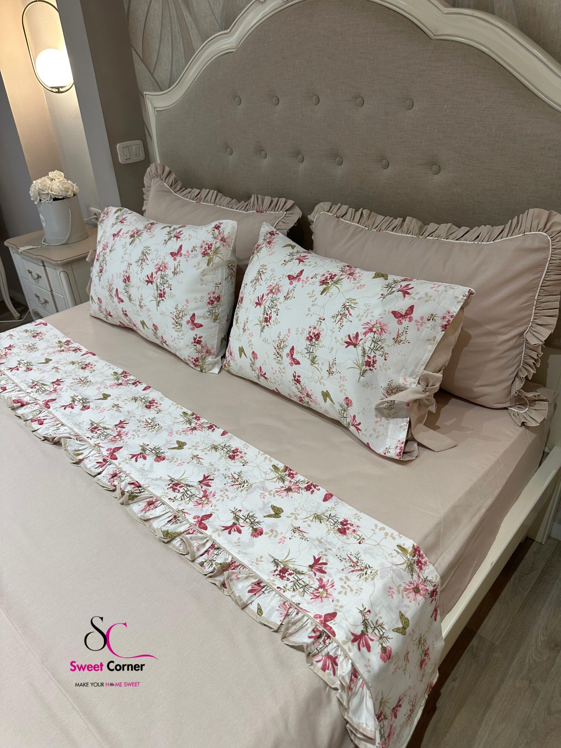 - 2 taies d’oreiller en coton avec volants beige et biais floral (80×60 cm)