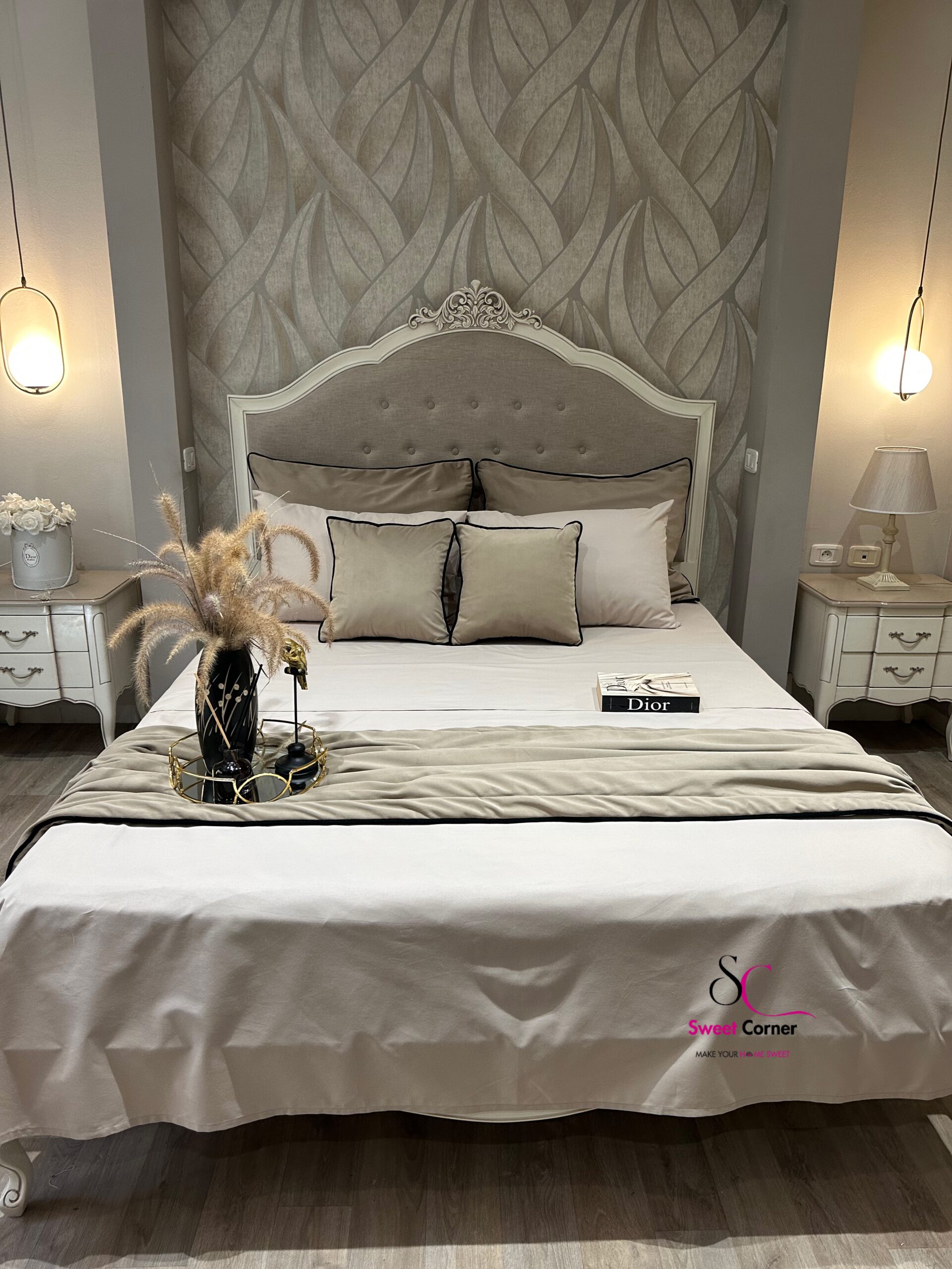 - Couleur : beige nude et Grège (Coussins et chemin réversibles) avec détails noirs