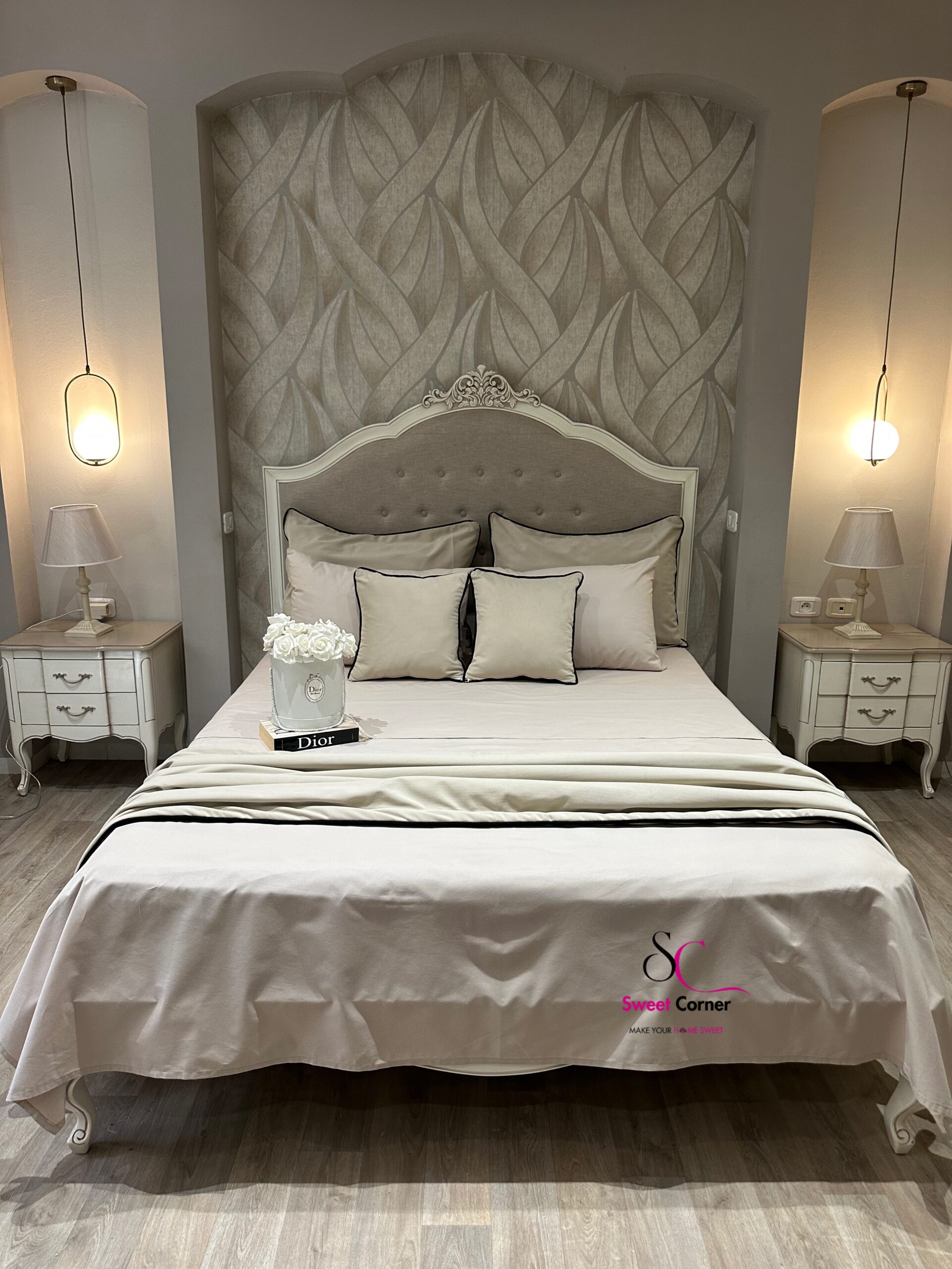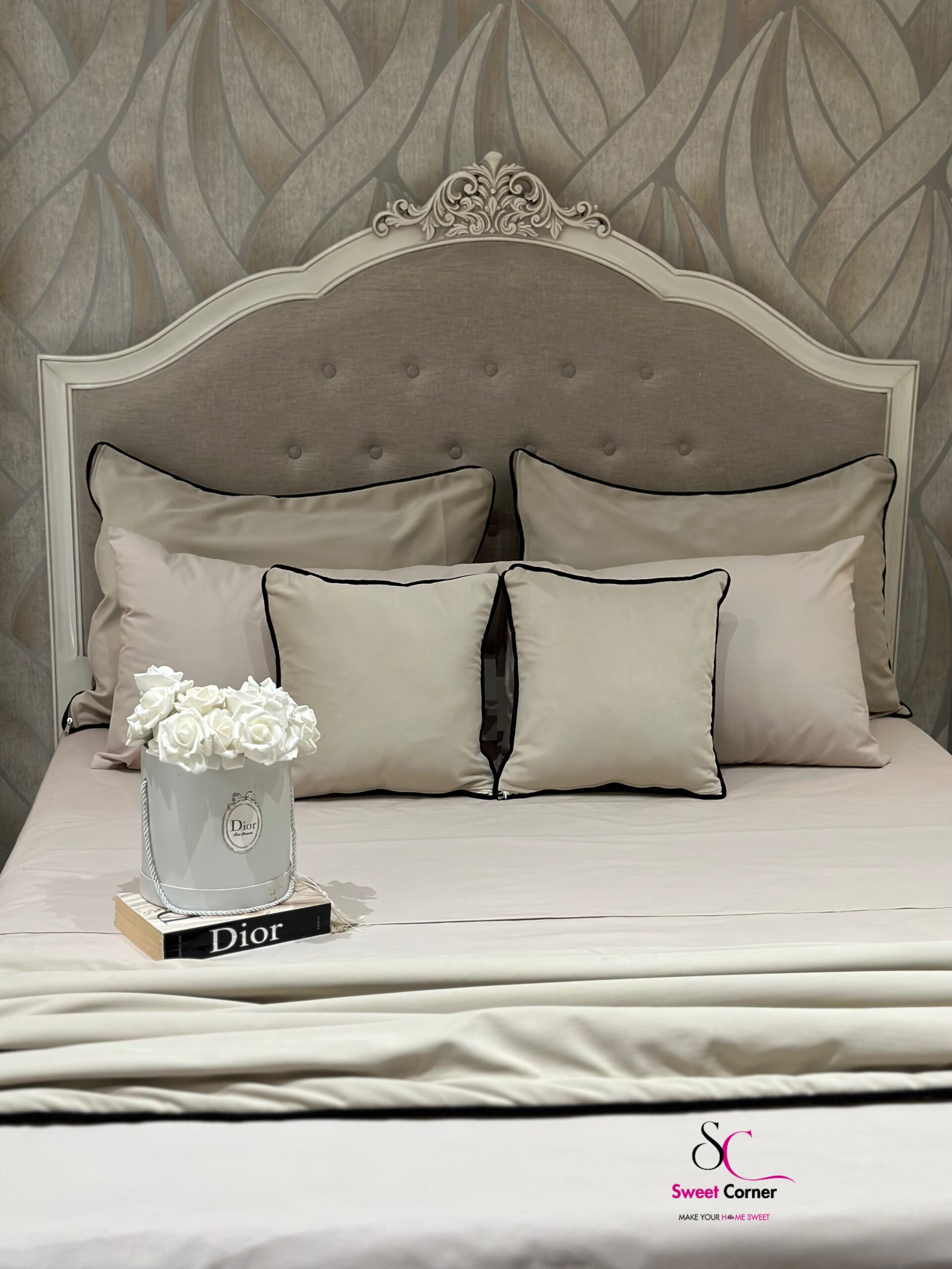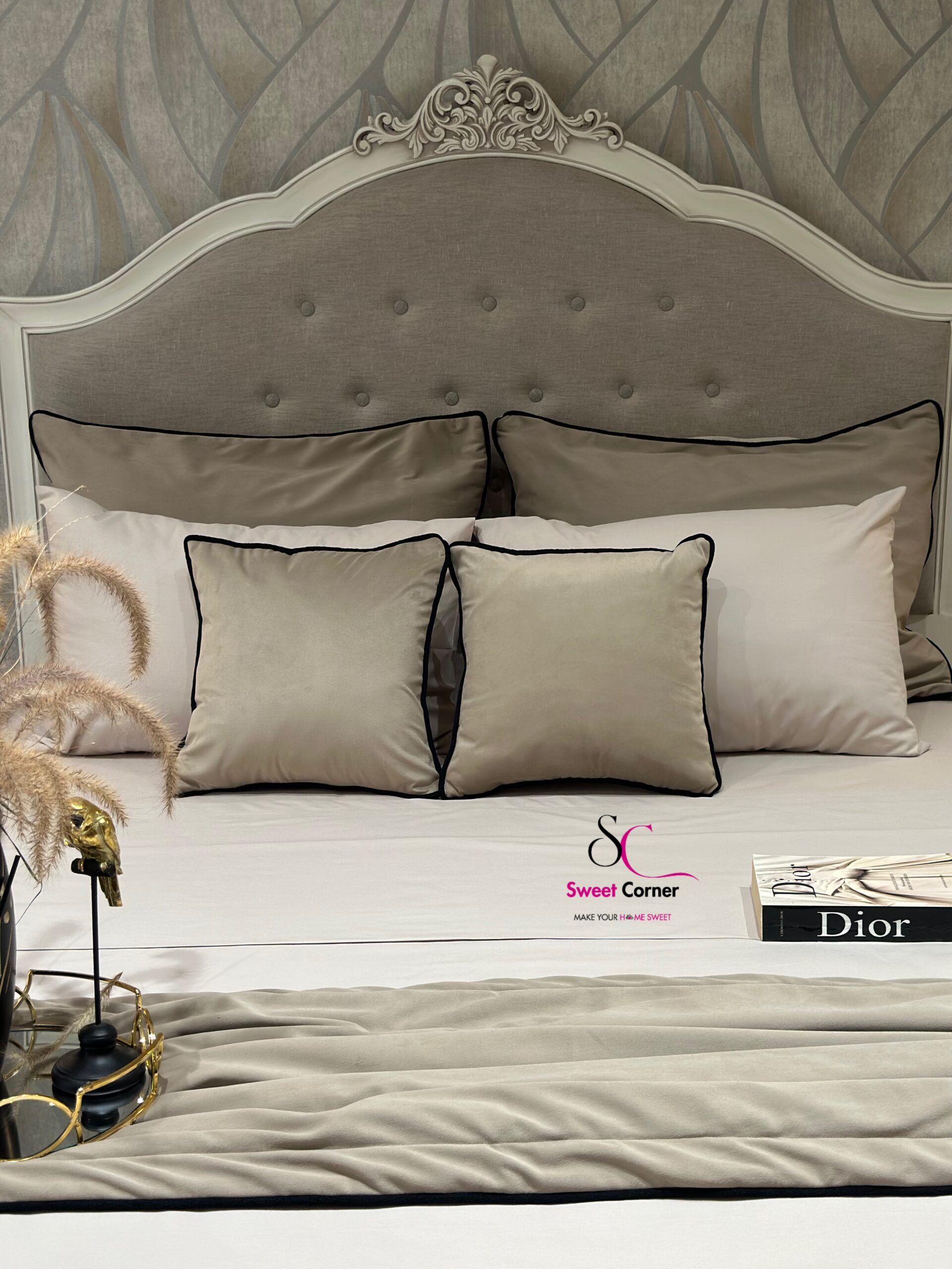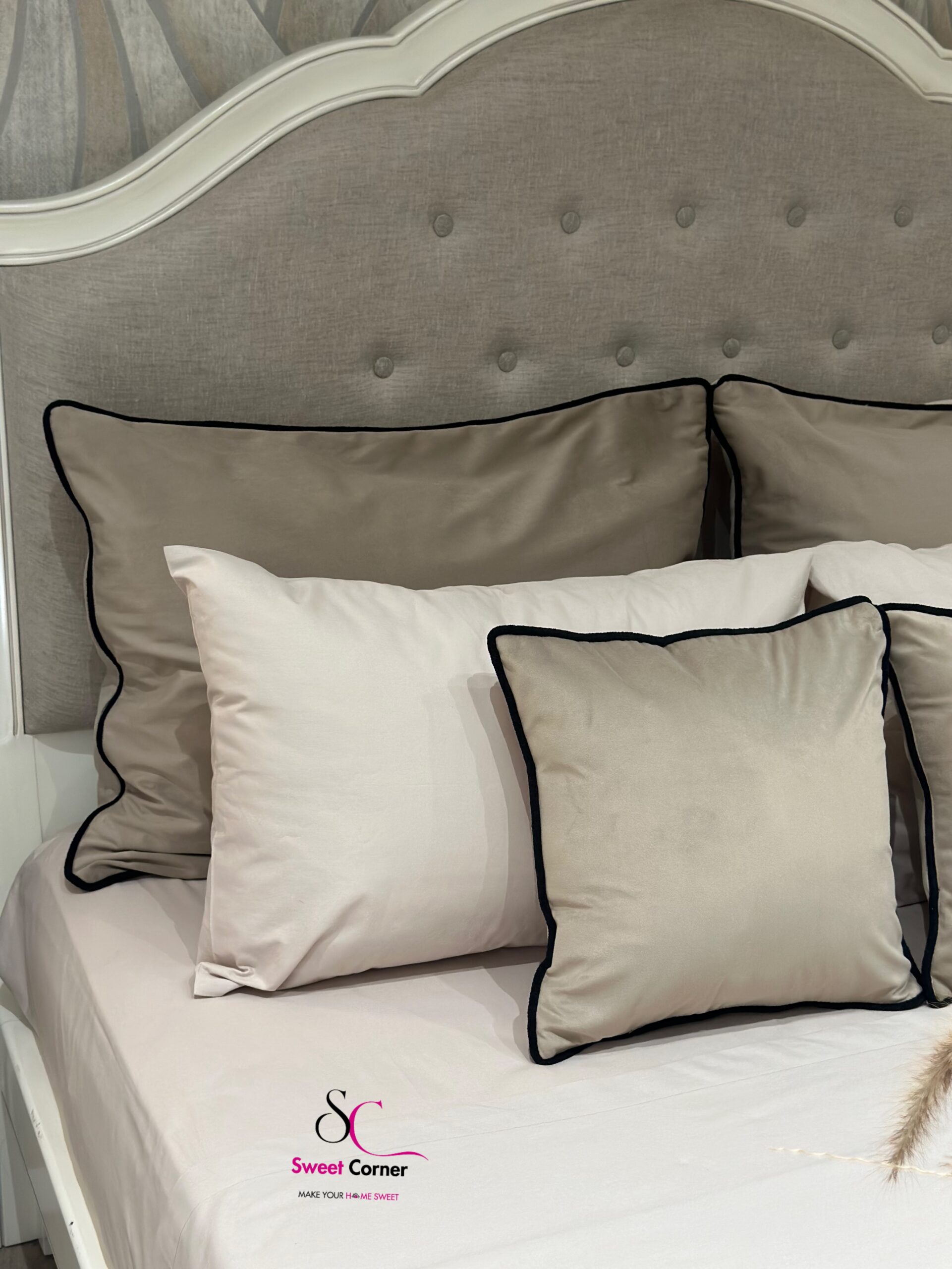 D’un beige délicat sublimé par un liseré noir contrastant avec des Coussins et un chemin réversibles.