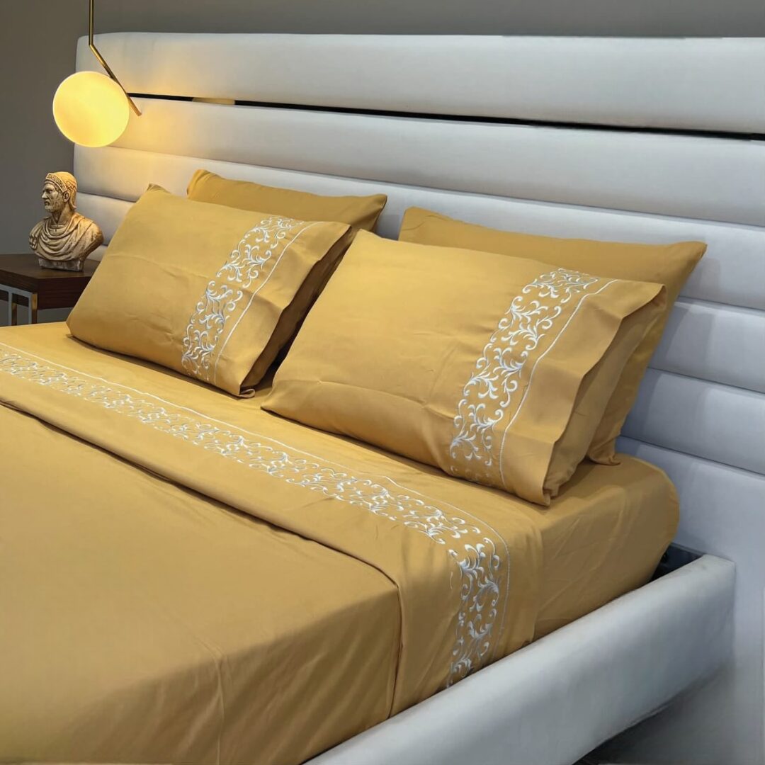 Parure de lit en coton Jaune brodé de motifs floraux – Apportez une touche de romantisme à votre chambre avec cette parure de lit en coton. La broderie anglaise délicate rehausse l’élégance de cette pièce. Le coton doux et respirant vous garantit des nuits de sommeil réparatrices.