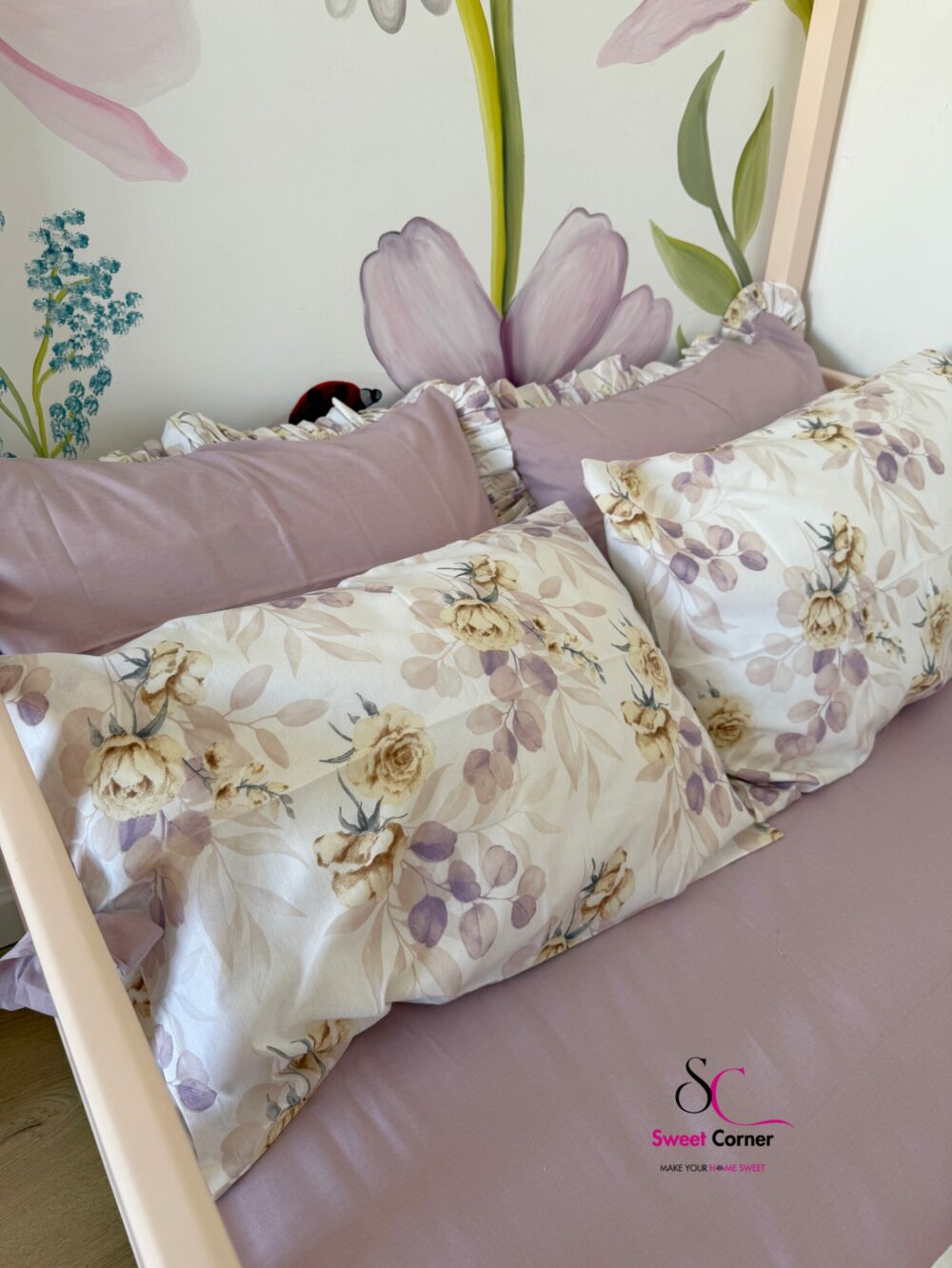 - Une taie d’oreiller unie de couleur lavande avec des Vollants à imprimé floral ( 2 Si mesure 140/190 )